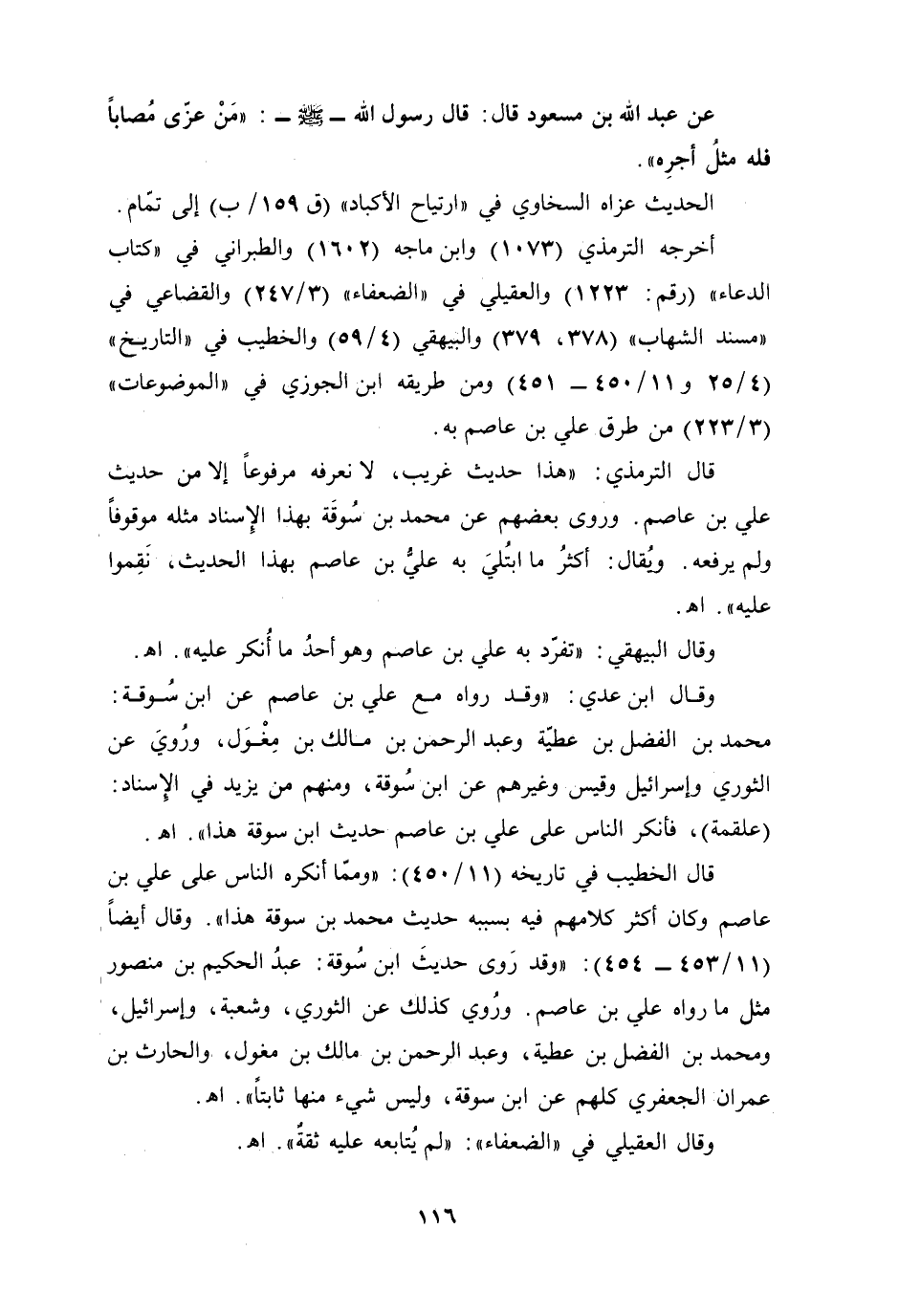 عن عبد الله بن مسعود قال: قال رسول الله - صلى الله عليه وسلم -: "مَنْ عزّى مُصابًا فله مثلُ أجرِه".