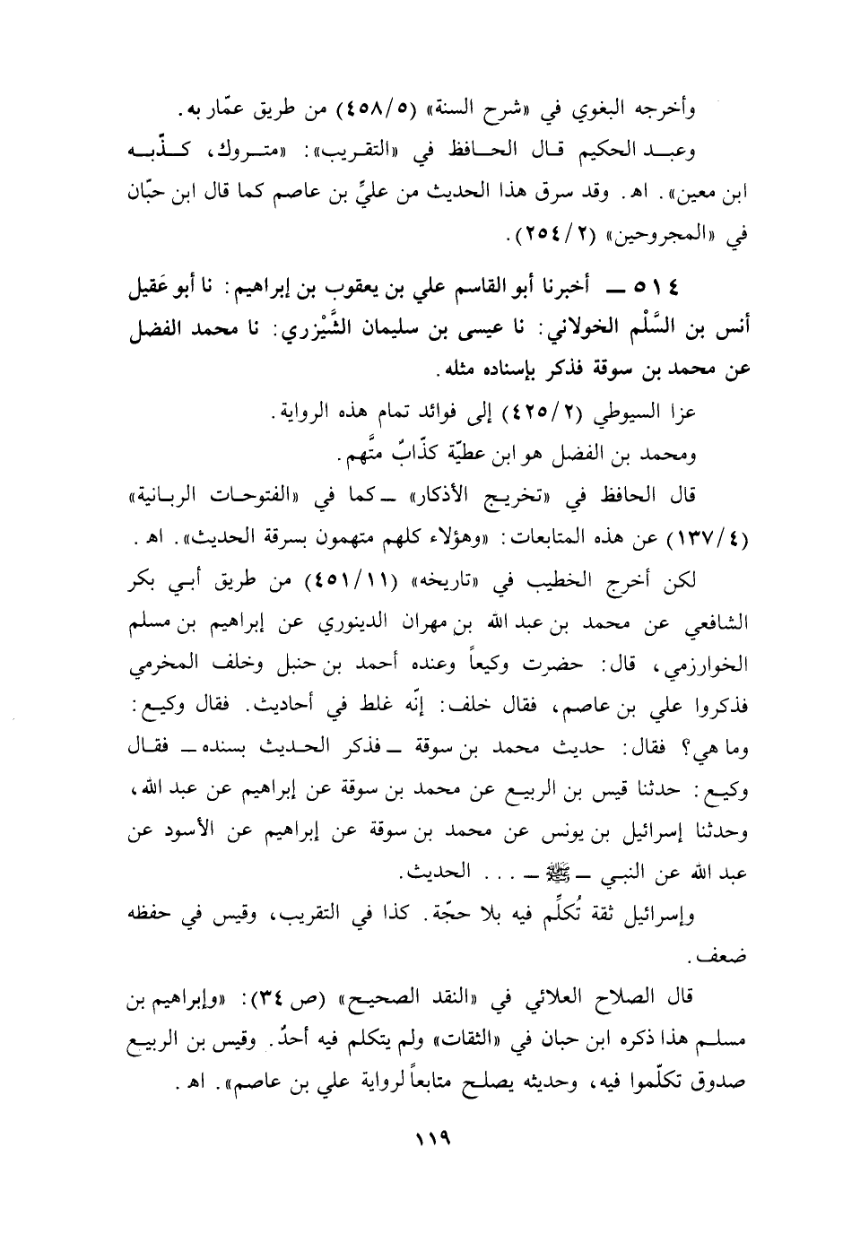 قال الصلاح العلائي في "النقد الصحيح" (ص 34): "وإبراهيم بن مسلم هذا ذكره ابن حبان في "الثقات" ولم يتكلم فيه أحدٌ. وقيس بن الربيع صدوق تكلّموا فيه، وحديثه يصلح متابعًا لرواية علي بن عاصم". أهـ.