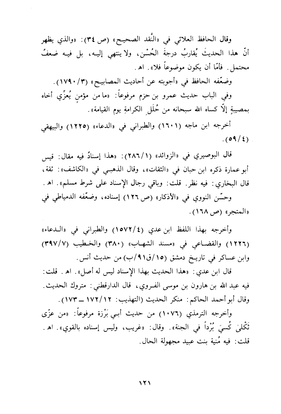 وقال الحافظ العلائي في "النَّقد الصحيح" (ص 34): "والذي يظهر أنّ هذا الحديثَ يُقاربُ درجةَ الحُسْن، ولا ينتهي إليه، بل فيه ضعفٌ محتمل. فأمّا أن يكون موضوعًا فلا". أهـ.