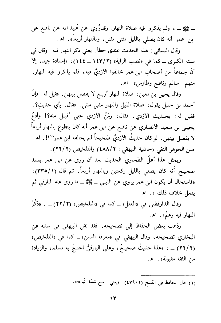 وقال النسائي: هذا الحديث عندي خطأ. يعني ذكر النهار فيه. وقال في سننه الكبرى - كما في "نصب الراية " (2/ 143 - 144): "إسنادة جيد، إلاّ أنّ جماعةً من أصحاب ابن عمر خالفوا الأزديَّ فيه، فلم يذكروا فيه النهار، منهم: سالم ونافع وطاوس". أهـ.