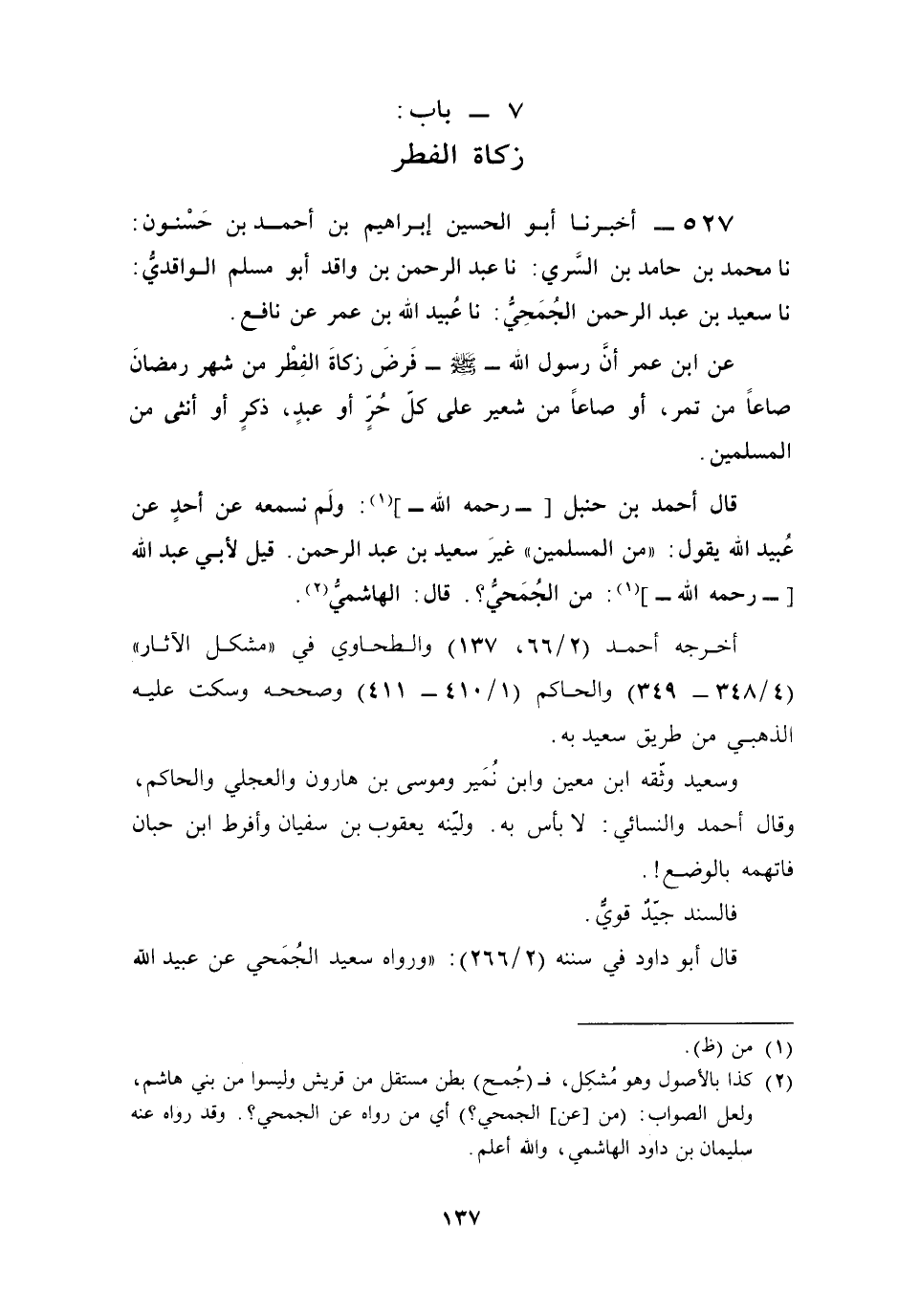 (¬2) كذا بالأصول وهو مُشكِل، ف (جُمح) بطن مستقل من قريش وليسوا من بني هاشم، ولعل الصواب: (من [عن] الجمحي؟) أي من رواه عن الجمحي؟. وقد رواه عنه سليمان بن داود الهاشمي، والله أعلم.