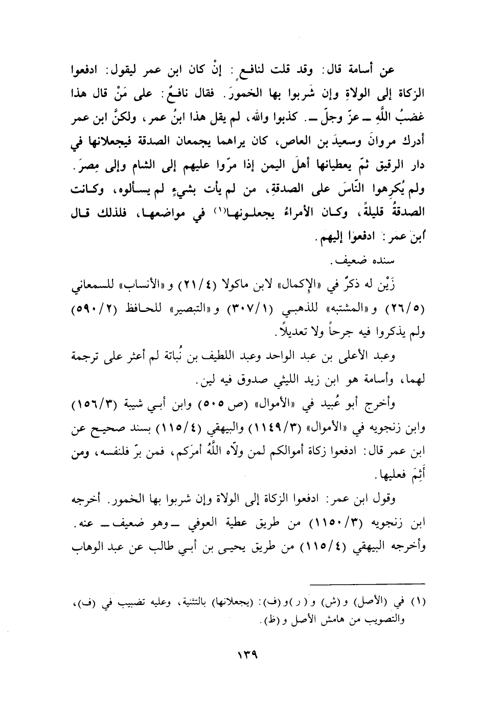 وقول ابن عمر: ادفعوا الزكاة إلى الولاة وإن شربوا بها الخمور. أخرجه ابن زنجويه (3/ 1150) من طريق عطية العوفي -وهو ضعيف- عنه. وأخرجه البيهقي (4/ 115) من طريق يحيى بن أبي طالب عن عبد الوهاب
