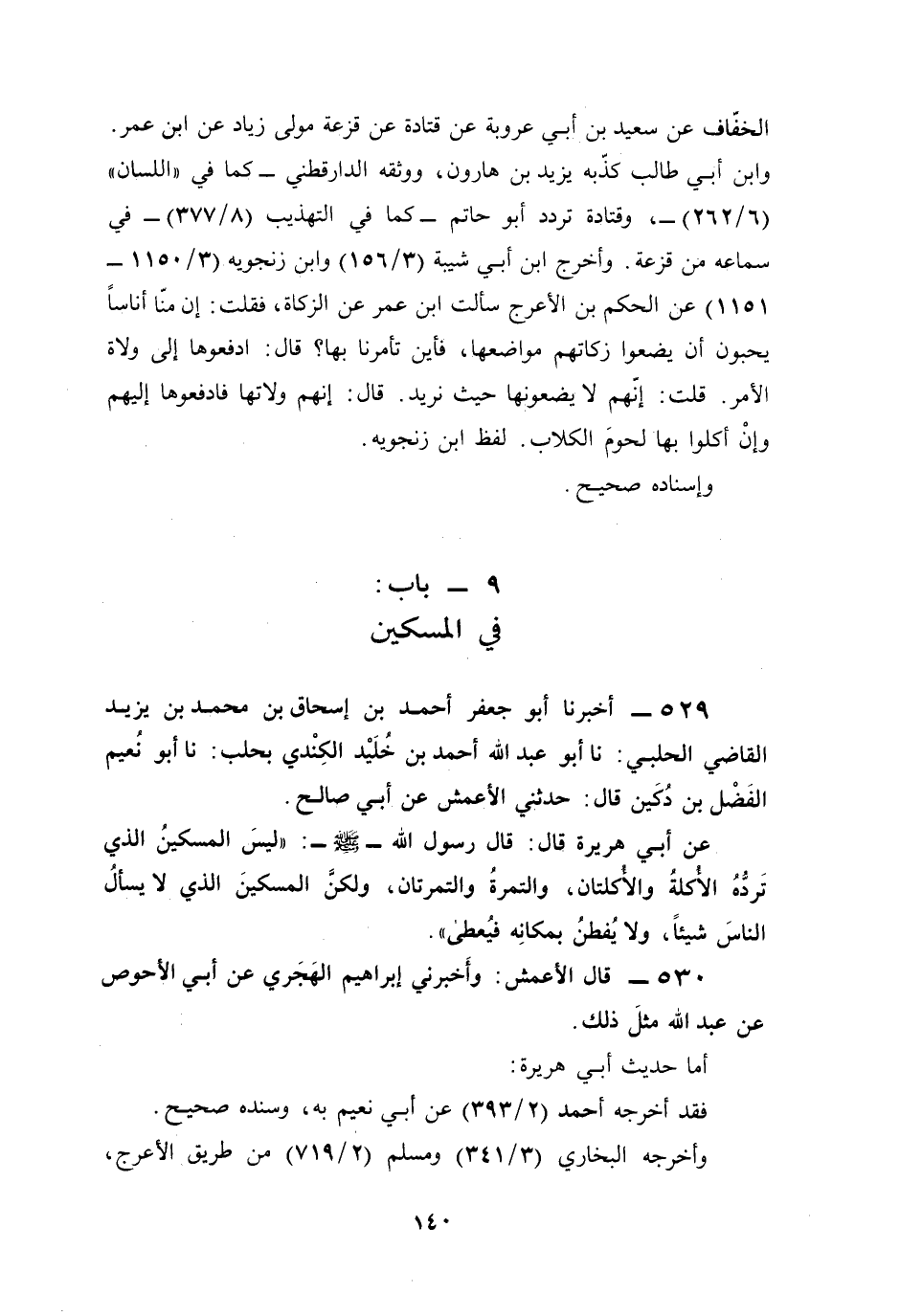 الخفّاف عن سعيد بن أبي عروبة عن قتادة عن قزعة مولى زياد عن ابن عمر. وابن أبي طالب كذّبه يزيد بن هارون، ووثقه الدارقطني -كما في "اللسان" (6/ 262) -، وقتادة تردد أبو حاتم -كما في التهذيب (8/ 377) - في سماعه من قزعة. وأخرج ابن أبي شيبة (3/ 156) وابن زنجويه (3/ 1150 - 1151) عن الحكم بن الأعرج سألت ابن عمر عن الزكاة، فقلت: إن منّا أناسًا يحبون أن يضعوا زكاتهم مواضعها، فأين تأمرنا بها؟ قال: ادفعوها إلى ولاة الأمر. قلت: إنّهم لا يضعونها حيث نريد. قال: إنهم ولاتها فادفعوها إليهم وإنْ أكلوا بها لحومَ الكلاب. لفظ ابن زنجويه.