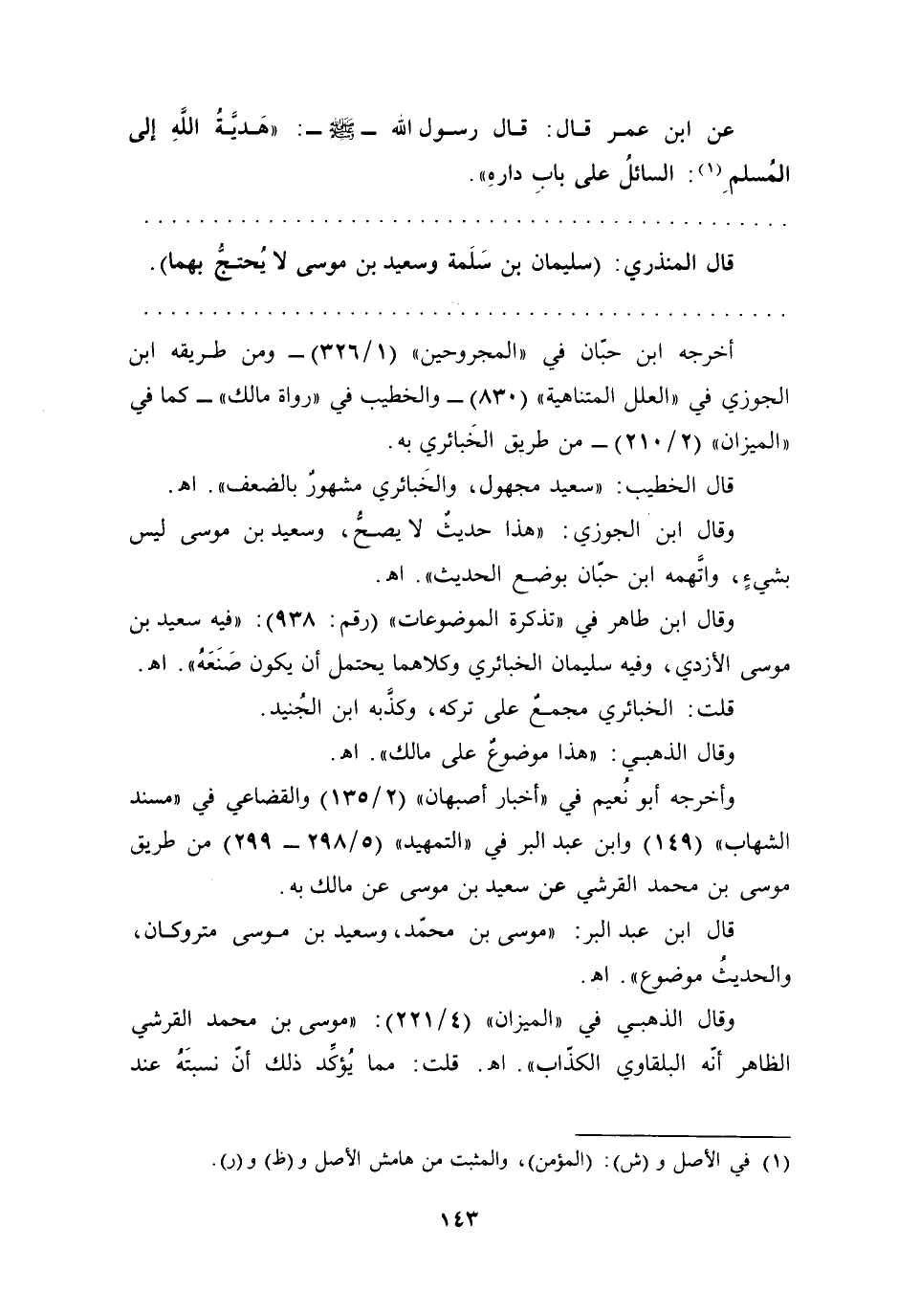 وأخرجه أبو نعيم في "أخبار أصبهان " (2/ 135) والقضاعي في "مسند الشهاب" (149) وابن عبد البر في "التمهيد" (5/ 298 - 299) من طريق موسى بن محمَّد القرشي عن سعيد بن موسى عن مالك به.