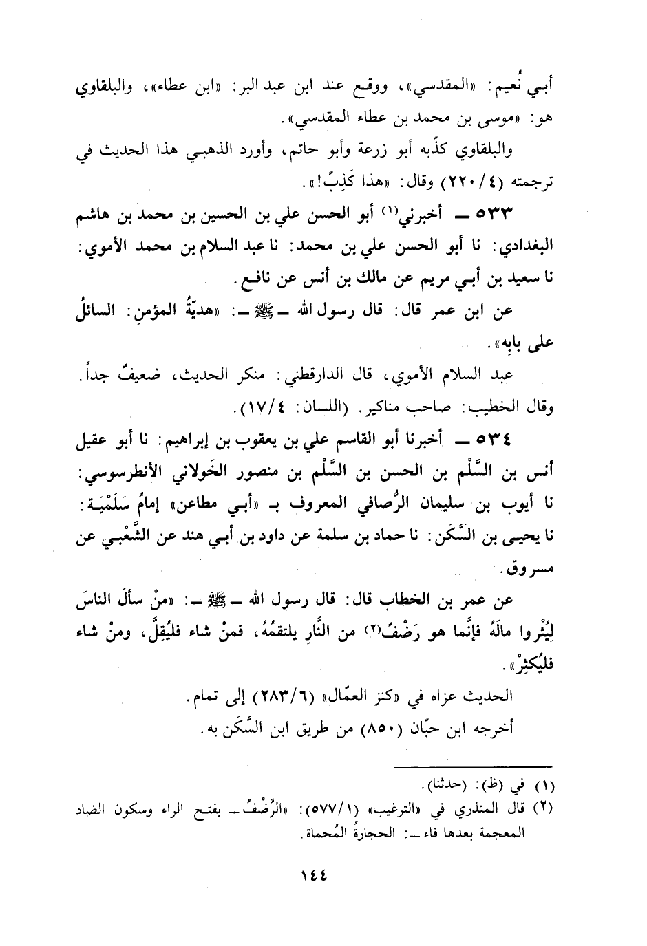 533 - أخبرني (¬1) أبو الحسن علي بن الحسين بن محمَّد بن هاشم البغدادي: نا أبو الحسن علي بن محمَّد: نا عبد السلام بن محمَّد الأموي: نا سعيد بن أبي مريم عن مالك بن أنس عن نافع.
