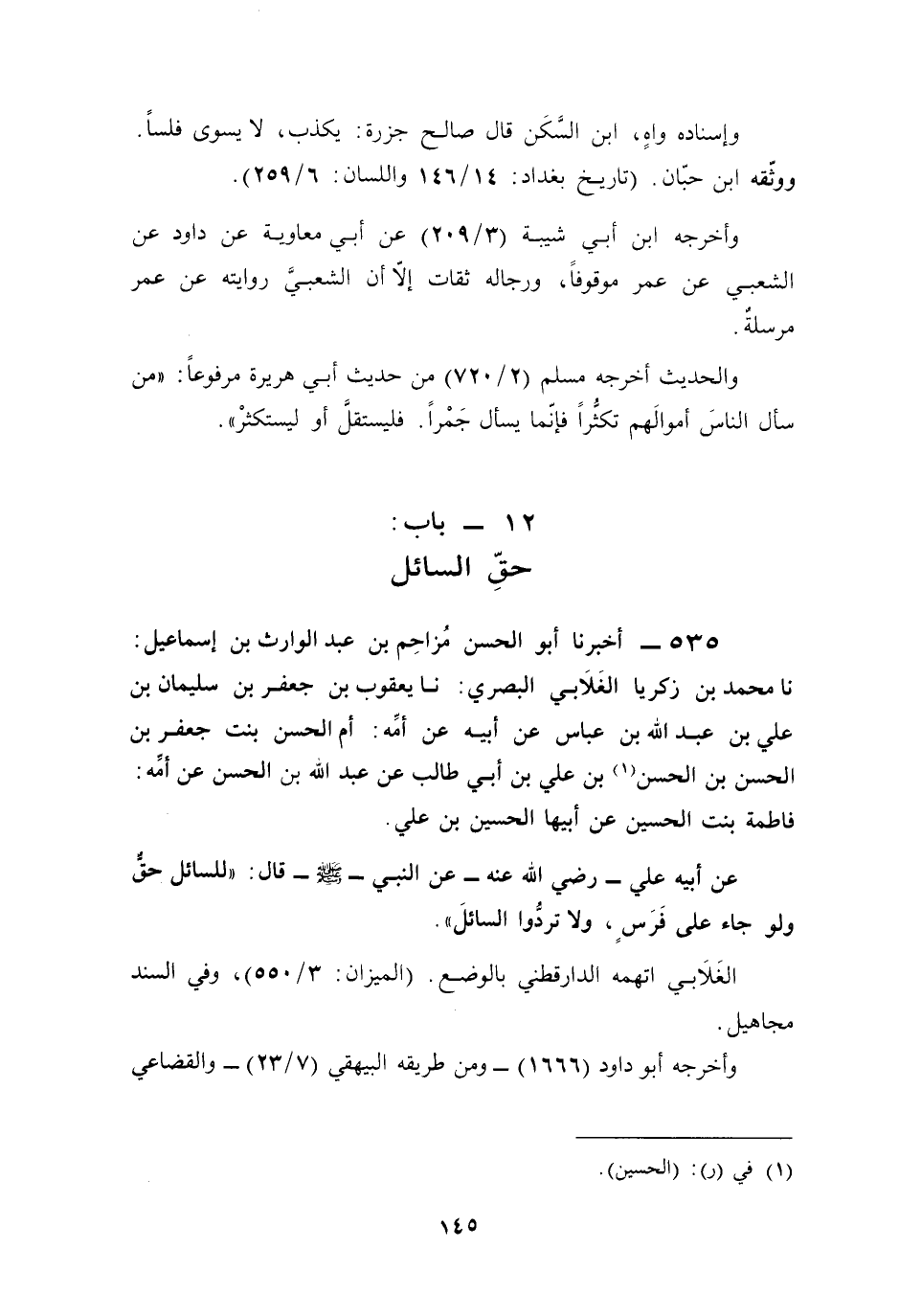 عن أبيه علي -رضي الله عنه - عن النبي - صلى الله عليه وسلم - قال: "للسائل حقٌّ ولو جاء على فَرَسٍ، ولا تردُّوا السائلَ".