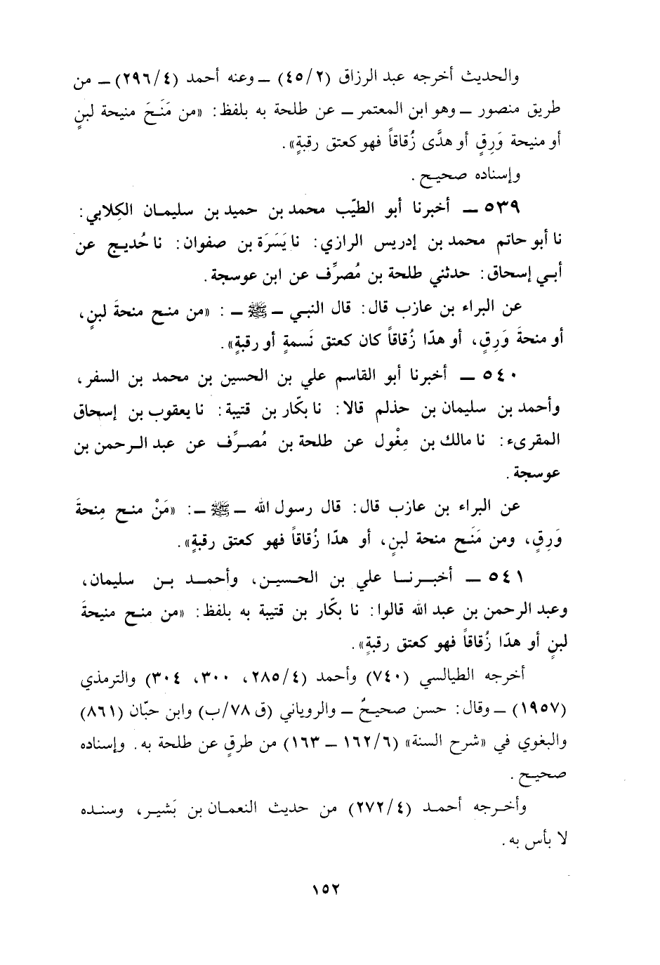 541 - أخبرنا علي بن الحسين، وأحمد بن سليمان، وعبد الرحمن بن عبد الله قالوا: نا بكّار بن قتيبة به بلفظ: "من منح منيحةَ لبنٍ أو هدّا زُقاقًا فهو كعتق رقبةٍ".