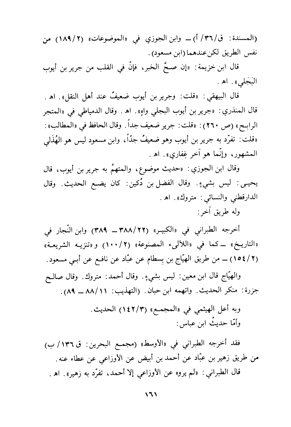 قال البيهقي: "قلت: وجرير بن أيوب ضعيفٌ عند أهل النقل". أهـ. قال المنذري: "جرير بن أيوب البجلي واهٍ". أهـ. وقال الدمياطي في "المتجر الرابح" (ص 260): "قلت: جرير ضعيف جدًا. وقال الحافظ في "المطالب": "قلت: تفرّد به جرير بن أيوب وهو ضعيف جدًّا، وابن مسعود ليس هو الهُذَلي المشهور، وإنّما هو آخر غِفاري". أهـ.