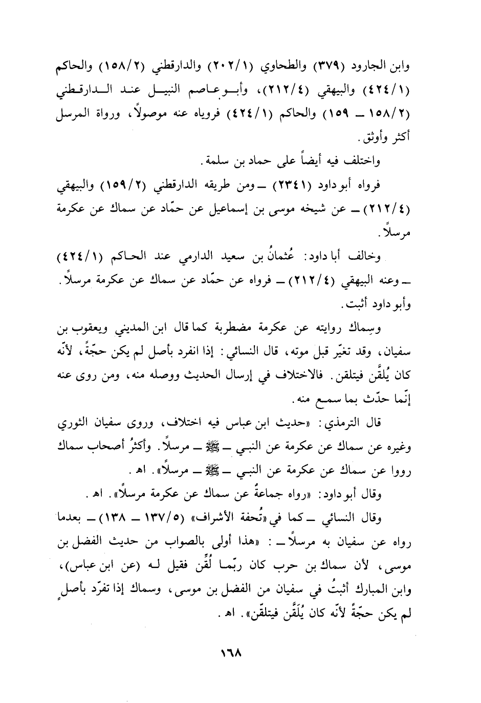 قال الترمذي: "حديث ابن عباس فيه اختلاف، وروى سفيان الثوري وغيره عن سماك عن عكرمة عن النبي - صلى الله عليه وسلم - مرسلًا. وأكثرُ أصحاب سماك رووا عن سماك عن عكرمة عن النبي - صلى الله عليه وسلم - مرسلًا". أهـ.