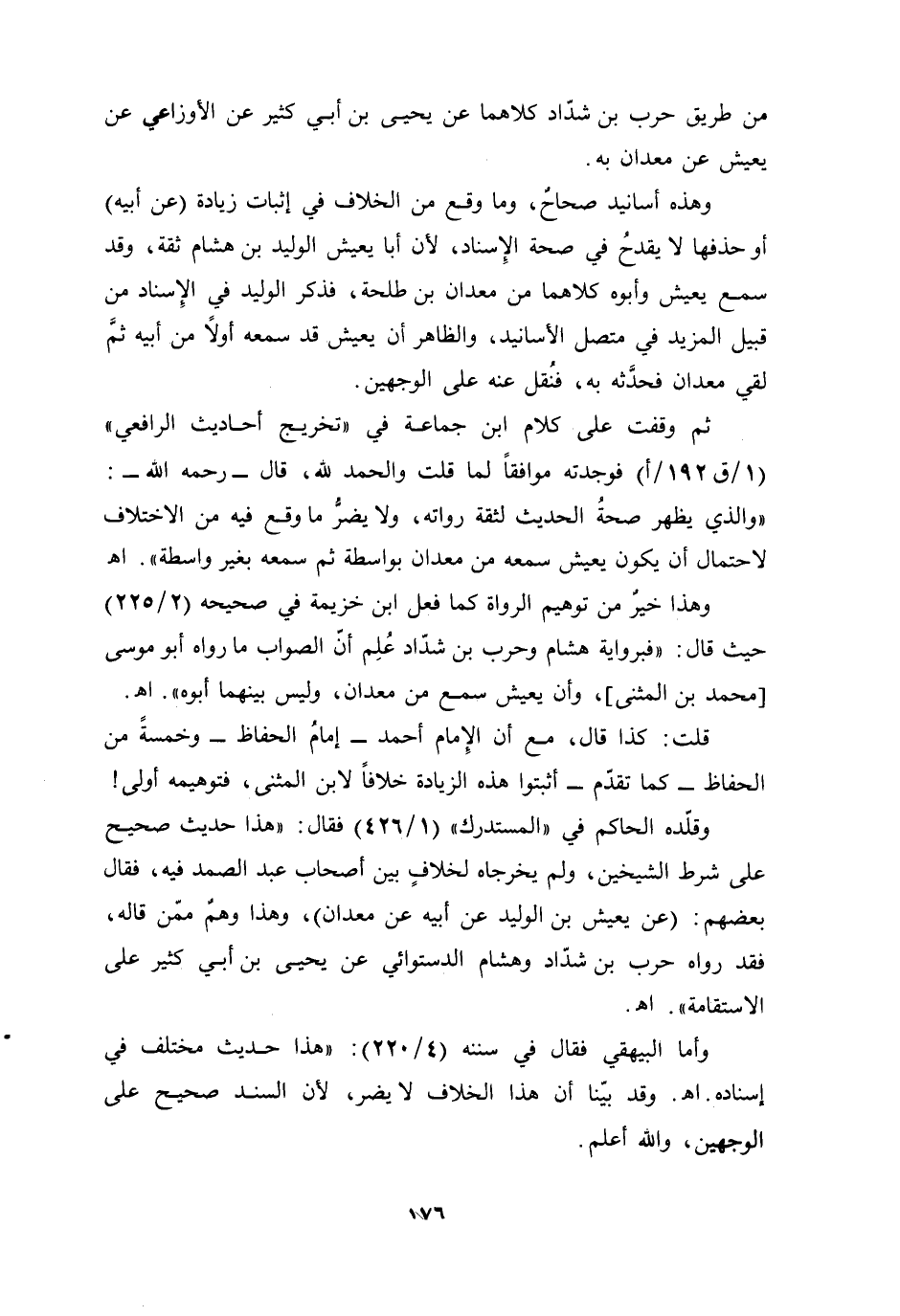 ثم وقفت على كلام ابن جماعة في "تخريج أحاديث الرافعي" (1/ ق 192/ أ) فوجدته موافقًا لما قلت والحمد لله، قال -رحمه الله-: "والذي يظهر صحةُ الحديث لثقة رواته، ولا يضرُّ ما وقع فيه من الاختلاف لاحتمال أن يكون يعيش سمعه من معدان بواسطة ثم سمعه بغير واسطة". أهـ
