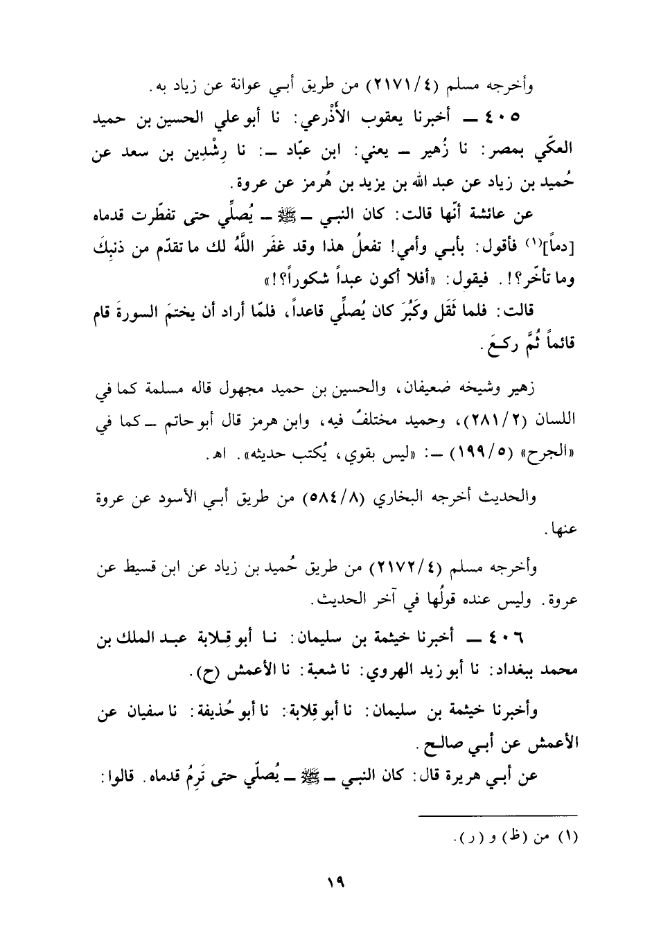 عن أبي هريرة قال: كان النبي - صلى الله عليه وسلم - يُصلّي حتى تَرِمُ قدماه. قالوا:
