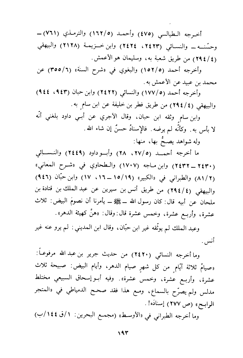 وما أخرجه النسائي (2420) من حديث جرير بن عبد الله مرفوعًا: "صيامُ ثلاثة أيّامٍ من كل شهرٍ صيام الدهر، وأيام البيض: صبيحة ثلاث عشرة، وأربع عشرة، وخمس عشرة". وفيه أبو إسحاق السبيعي مختلط مدلس ولم يصرّح بالسماع، ومع هذا فقد صحح الدمياطي في "المتجر الرابح" (ص 277) إسنادَه!.