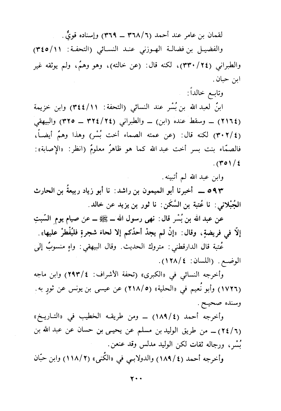 ابنٌ لعبد الله بن بُسْر عند النسائي (التحفة: 11/ 344) وابن خزيمة (2164) -وسقط عنده (ابن) - والطبراني (24/ 324 - 325) والبيهقي (4/ 302) لكنه قال. (عن عمته الصماء أخت بُسْر) وهذا وهمٌ أيضًا، فالصمّاء بنت بسر أخت عبد الله كما هو ظاهرٌ معلومٌ (انظر: "الإِصابة": 4/ 351).