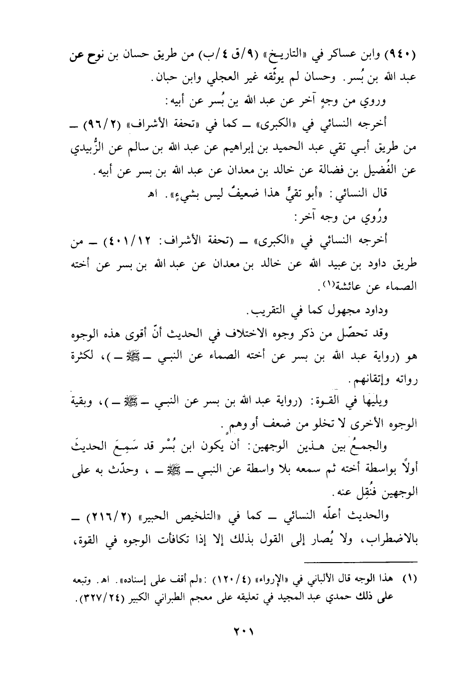 والجمعُ بين هذين الوجهين: أن يكون ابن بُسْر قد سَمِعَ الحديثَ أولًا بواسطة أخته ثم سمعه بلا واسطة عن النبي - صلى الله عليه وسلم -، وحدّث به على الوجهين فنُقِل عنه.