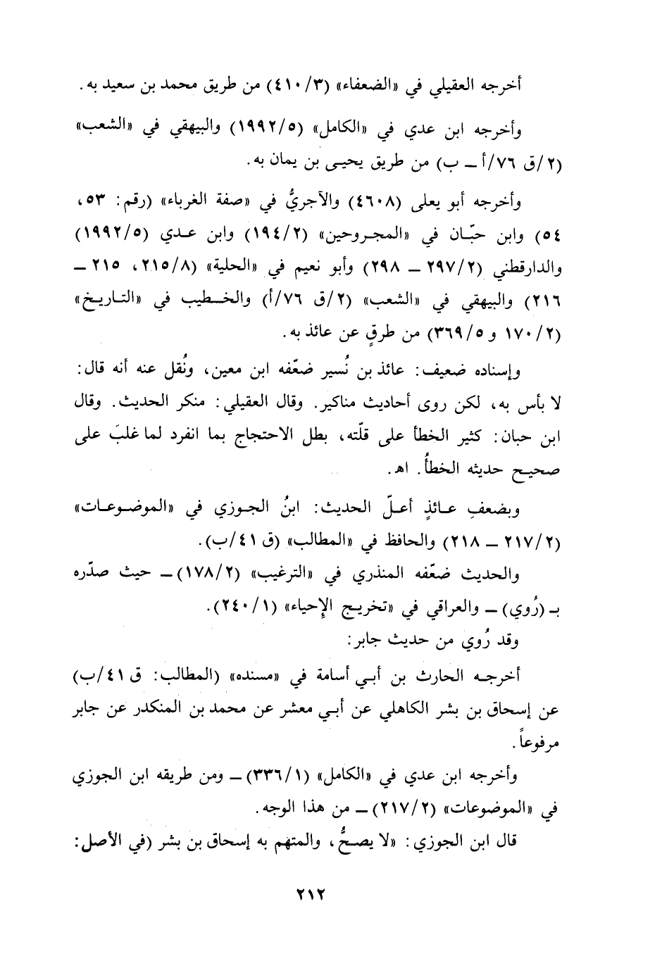 وأخرجه أبو يعلى (4608) والآجريُّ في "صفة الغرباء" (رقم: 53، 54) وابن حبّان في "المجروحين" (2/ 194) وابن عدي (5/ 1992) والدارقطني (2/ 297 - 298) وأبو نعيم في "الحلية" (8/ 215، 215 - 216) والبيهقي في "الشعب" (2/ ق 76/ أ) والخطيب في "التاريخ" (2/ 170 و 5/ 369) من طرقٍ عن عائذ به.