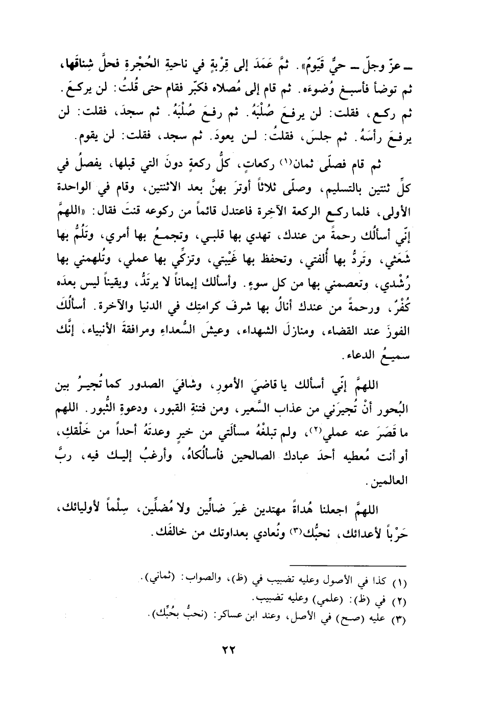 ثم قام فصلّى ثمان (¬1) ركعاتٍ، كلُّ ركعةٍ دونَ التي قبلها، يفصلُ في كلِّ ثنتين بالتسليم، وصلّى ثلاثًا أوترَ بهنَّ بعد الاثنتين، وقام في الواحدة الأولى، فلما ركع الركعة الآخِرة فاعتدل قائمًا من ركوعه قنتَ فقال: "اللهمَّ إنّي أسألُك رحمةً من عندك، تهدي بها قلبي، وتجمعُ بها أمري، وتَلُمُّ بها شَعَثي، وتَردُّ بها أُلفتي، وتحفظ بها غَيْبتي، وتزكِّي بها عملي، وتُلهمني بها رُشْدي، وتعصمني بها من كل سوءٍ. وأسألك إيمانًا لا يرتَدُّ، ويقينًا ليس بعدَه كُفْرٌ، ورحمةً من عندك أنالُ بها شرفَ كرامتِك في الدنيا والآخرة. أسألُكَ الفوزَ عند القضاء، ومنازلَ الشهداء، وعيش السُّعداءِ ومرافقةَ الأنبياء، إنَّك سميعُ الدعاء.