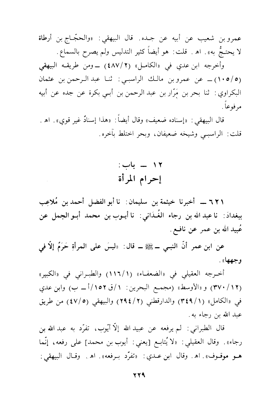 عمرو بن شعيب عن أبيه عن جده. قال البيهقي. "والحجّاج بن أرطاة لا يحتجُّ به". أهـ. قلت. هو أيضًا كثير التدليس ولم يصرح بالسماع.