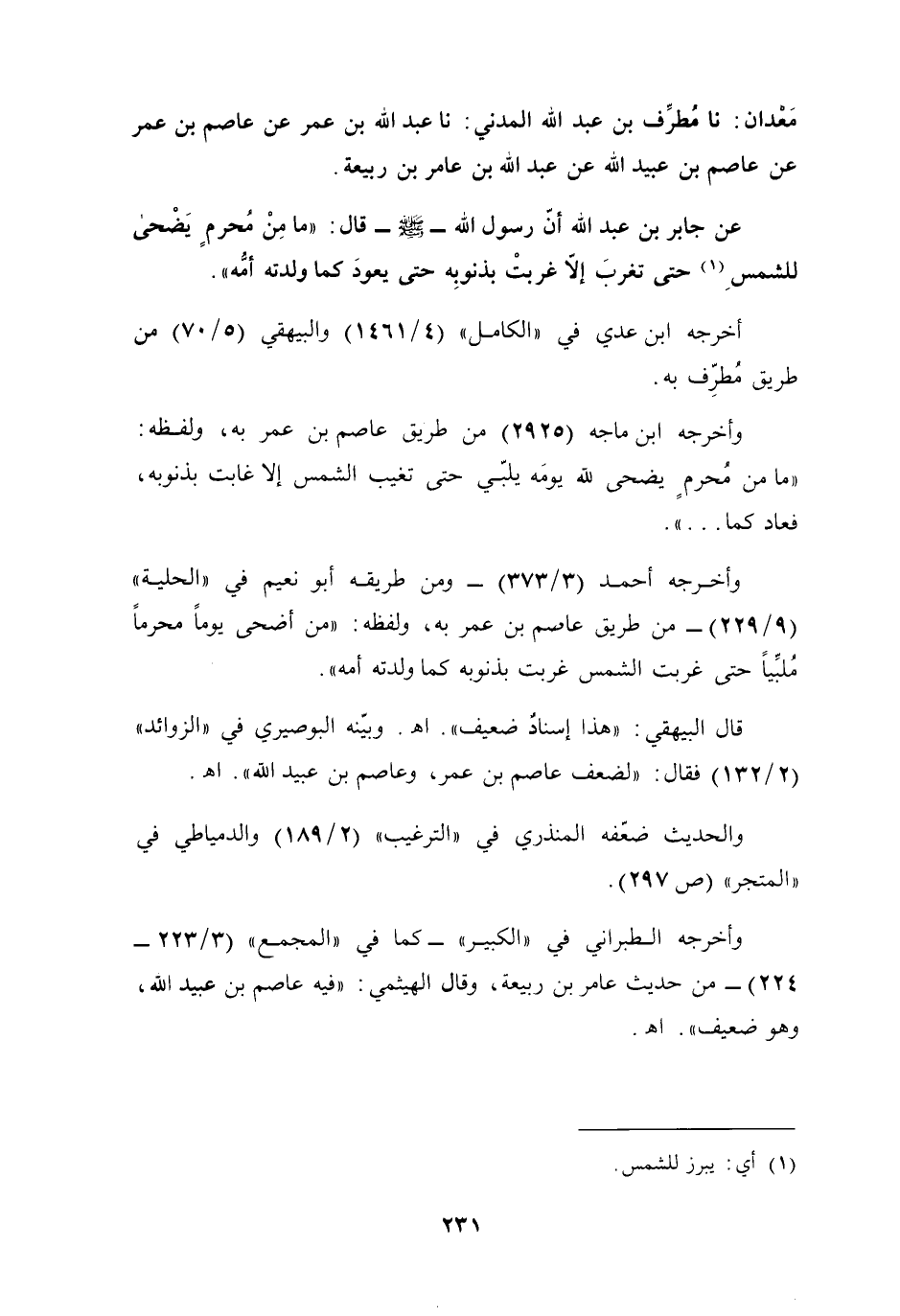 عن جابر بن عبد الله أن رسول الله - صلى الله عليه وسلم - قال: "ما مِنْ مُحرمٍ يَضْحى للشمسِ (¬1) حتى تغربَ إلَّا غربتْ بذنوبِه حتى يعودَ كما ولدته أمُّه".