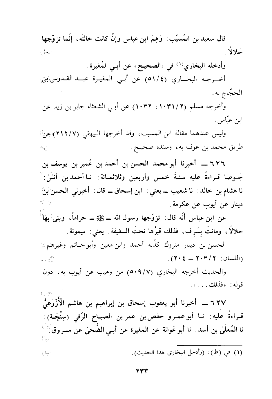 قال سعيد بن المُسيّب: وَهِمَ ابن عباس وإنْ كانت خالتَه، إنّما تزوّجها حَلالًا.