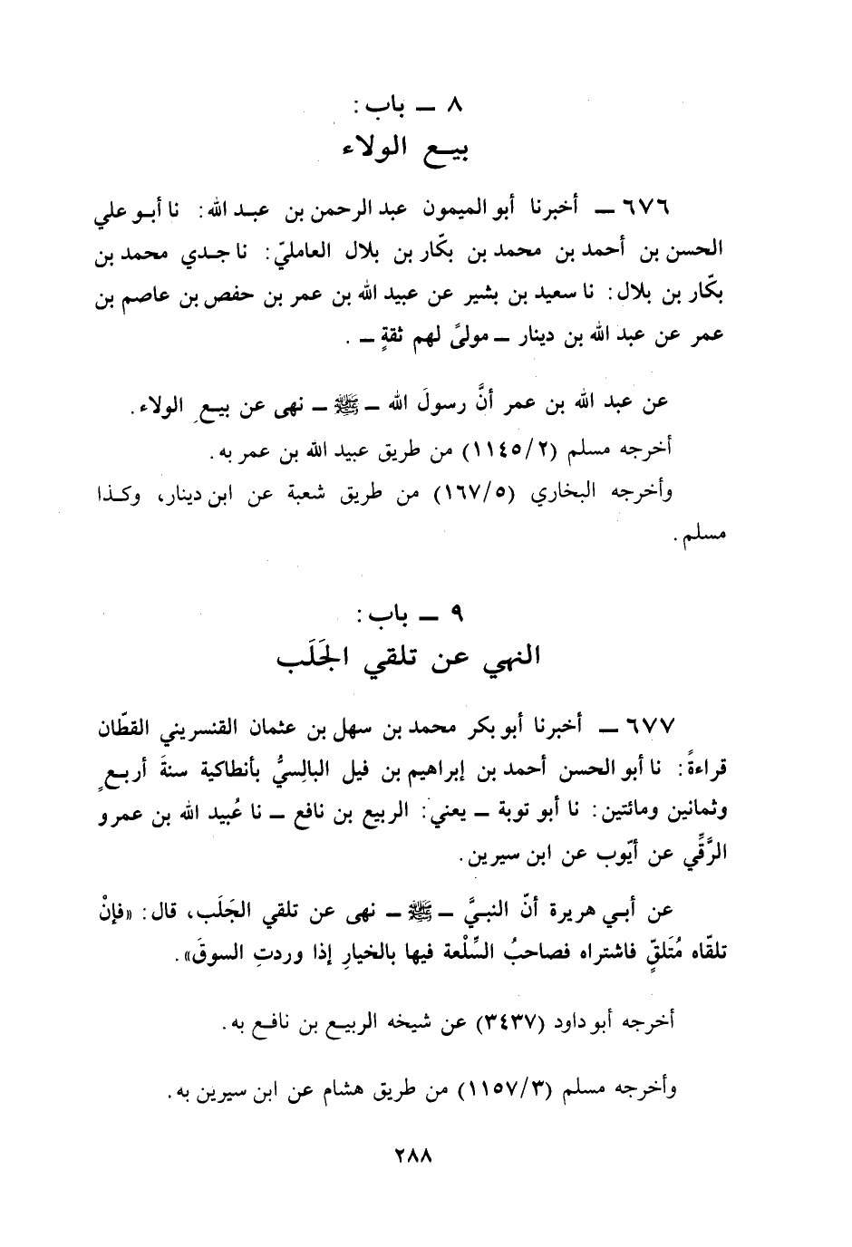 677 - أخبرنا أبو بكر محمَّد بن سهل بن عثمان القنسريني القطّان قراءةً: نا أبو الحسن أحمد بن إبراهيم بن فيل البالِسيُّ بأنطاكية سنةَ أربعٍ وثمانين ومائتين: نا أبو توبة -يعني: الربيع بن نافع- نا عُبيد الله بن عمرو الرَّقِّي عن أيوب عن ابن سيرين.