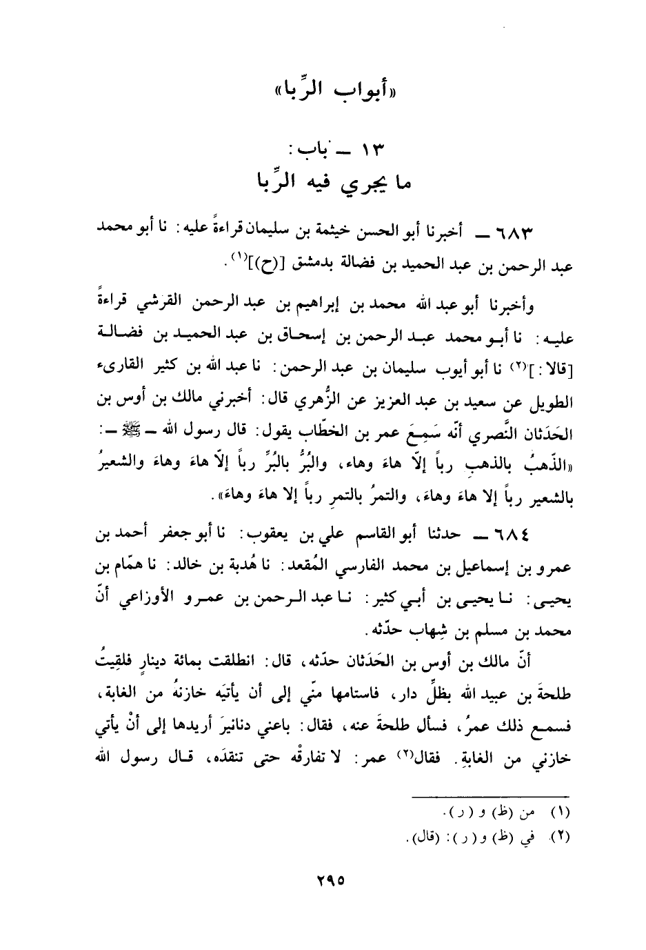 أنّ مالك بن أوس بن الحَدَثان حدّثه، قال: انطلقت بمائة دينارٍ فلقِيتُ طلحةَ بن عبيد الله بظلِّ دار، فاستامها منّي إلى أن يأتيَه خازنهُ من الغابة، فسمع ذلك عمرُ، فسأل طلحةَ عنه، فقال: باعني دنانيرَ أريدها إلى أنْ يأتي خازني من الغابةِ. فقال (2) عمر: لا تفارقْه حتى تنقدَه، قال رسول الله
