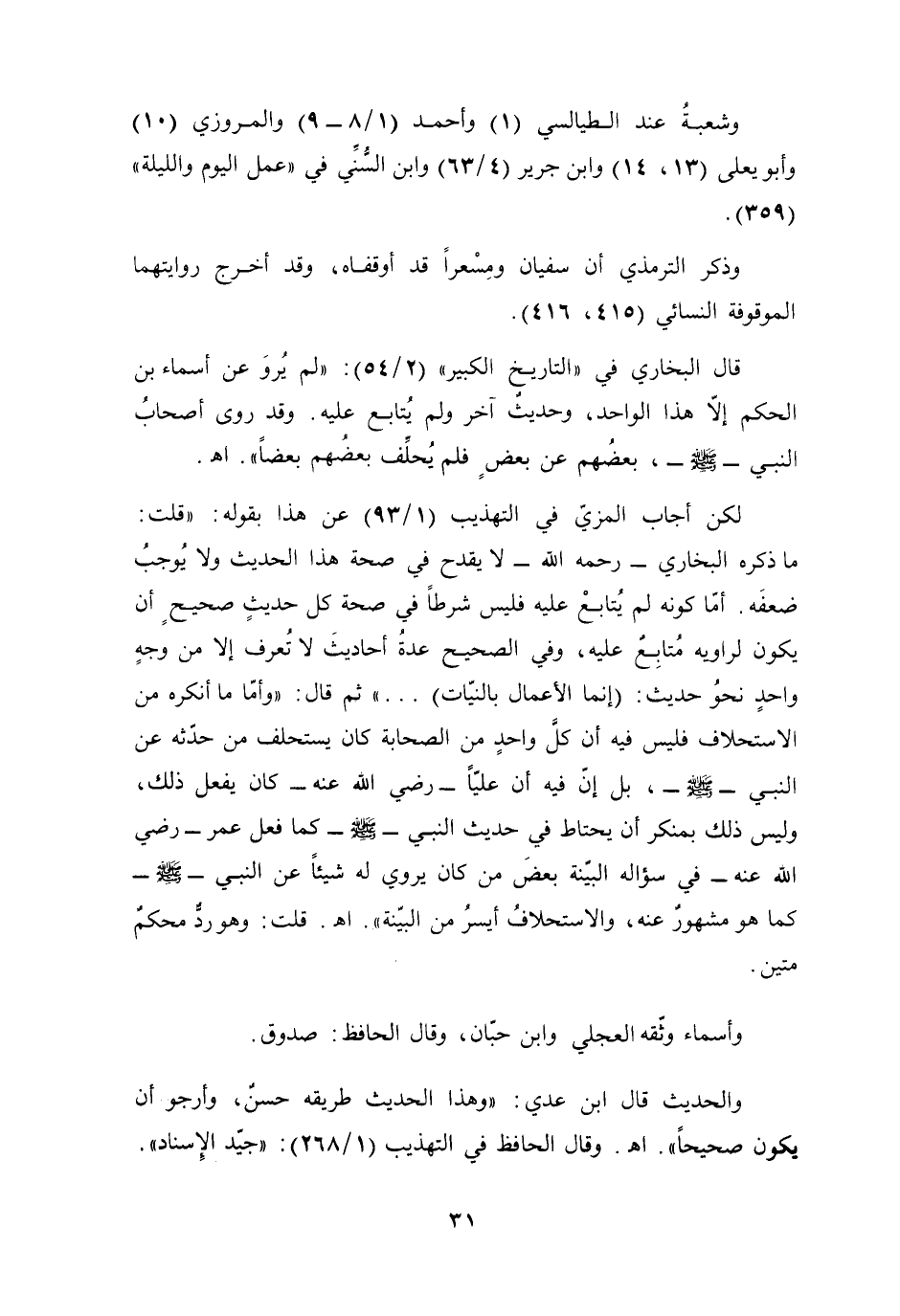 لكن أجاب المزيّ في التهذيب (1/ 93) عن هذا بقوله: "قلت: ما ذكره البخاري -رحمه الله- لا يقدح في صحة هذا الحديث ولا يُوجبُ ضعفَه. أمّا كونه لم يُتابعْ عليه فليس شرطًا في صحة كل حديثٍ صحيحٍ أن يكون لراويه مُتابِعٌ عليه، وفي الصحيح عدةُ أحاديثَ لا تُعرف إلا من وجهٍ واحدٍ نحوُ حديث: (إنما الأعمال بالنيّات) ... " ثم قال: "وأمّا ما أنكره من الاستحلاف فليس فيه أن كلَّ واحدٍ من الصحابة كان يستحلف من حدّثه عن النبي - صلى الله عليه وسلم -، بل إنّ فيه أن عليًّا - رضي الله عنه - كان يفعل ذلك، وليس ذلك بمنكر أن يحتاط في حديث النبي - صلى الله عليه وسلم - كما فعل عمر -رضي الله عنه - في سؤاله البيّنة بعضَ من كان يروي له شيئًا عن النبي - صلى الله عليه وسلم - كما هو مشهورٌ عنه، والاستحلافُ أيسرُ من البيّنة". أهـ. قلت: وهو ردٌّ محكمٌ متين.