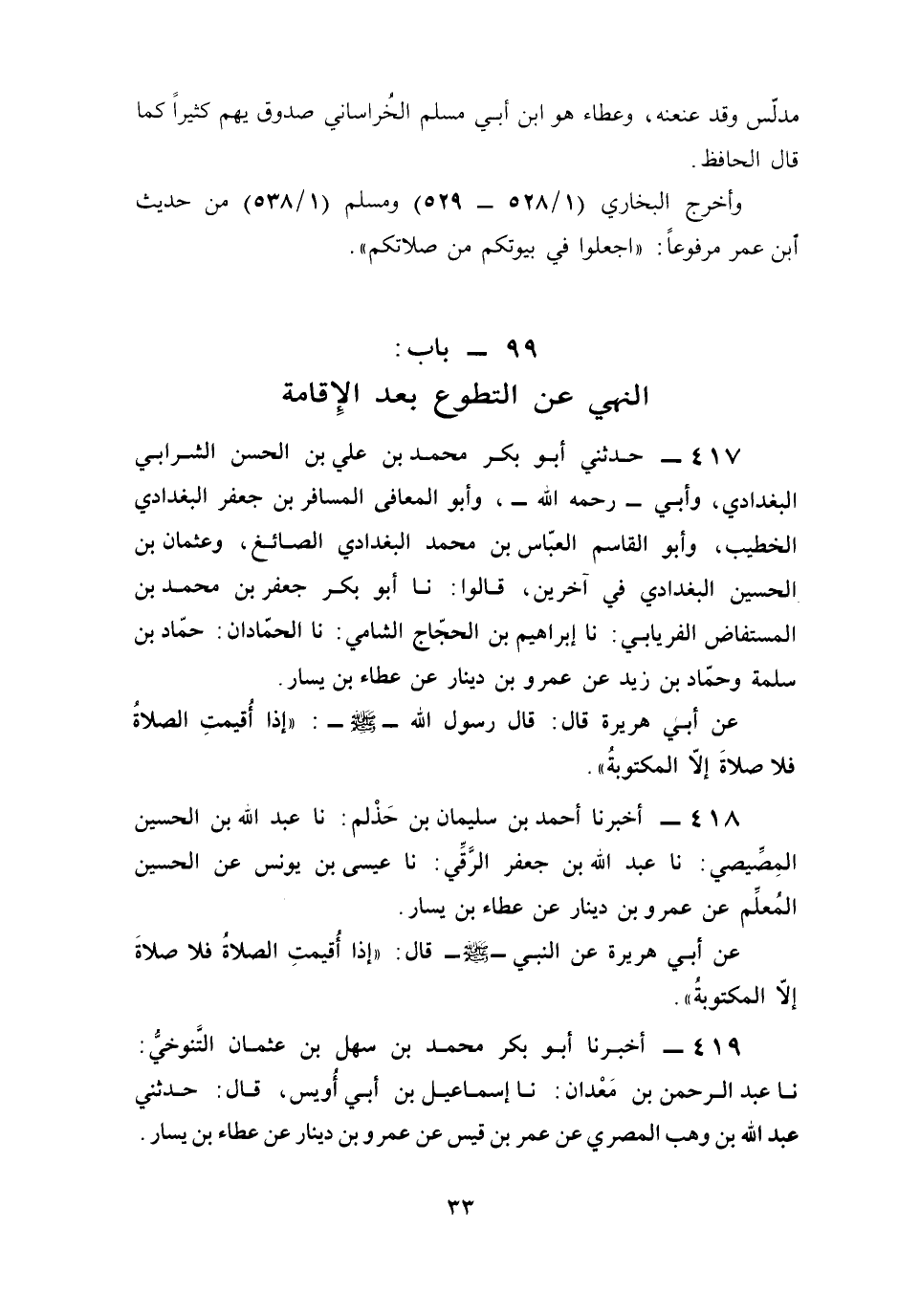 417 - حدثني أبو بكر محمَّد بن علي بن الحسن الشرابي البغدادي، وأبي -رحمه الله-، وأبو المعافى المسافر بن جعفر البغدادي الخطيب، وأبو القاسم العبّاس بن محمَّد البغدادي الصائغ، وعثمان بن الحسين البغدادي في آخرين، قالوا. نا أبو بكر جعفر بن محمَّد بن المستفاض الفريابي: نا إبراهيم بن الحجّاج الشامي: نا الحمّادان: حمّاد بن سلمة وحمّاد بن زيد عن عمرو بن دينار عن عطاء بن يسار.