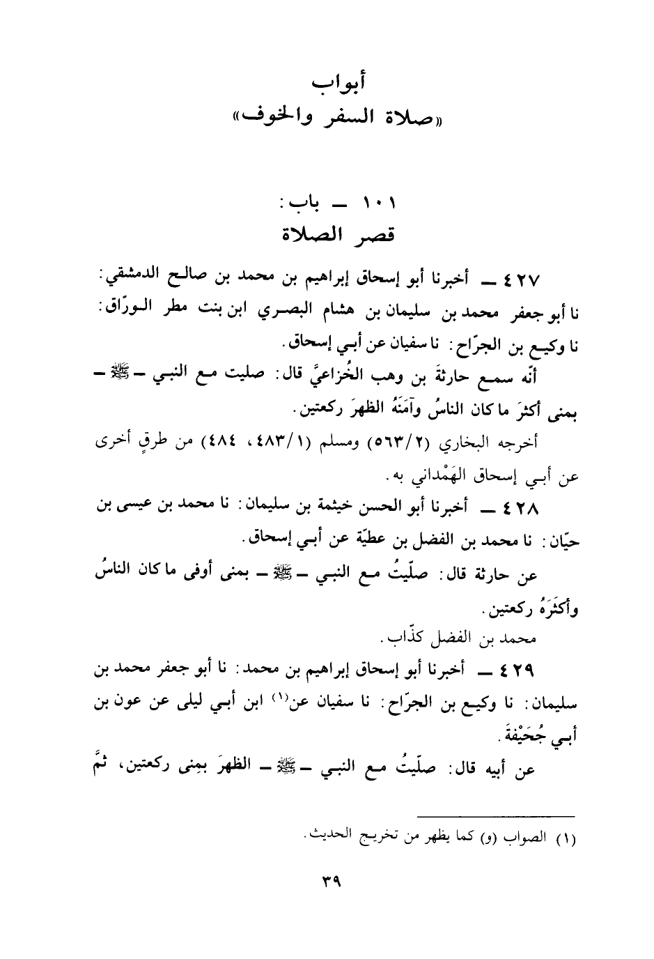 427 - أخبرنا أبو إسحاق إبراهيم بن محمَّد بن صالح الدمشقي: نا أبو جعفر محمَّد بن سليمان بن هشام البصري ابن بنت مطر الورّاق: نا وكيع بن الجرّاح: نا سفيان عن أبي إسحاق.