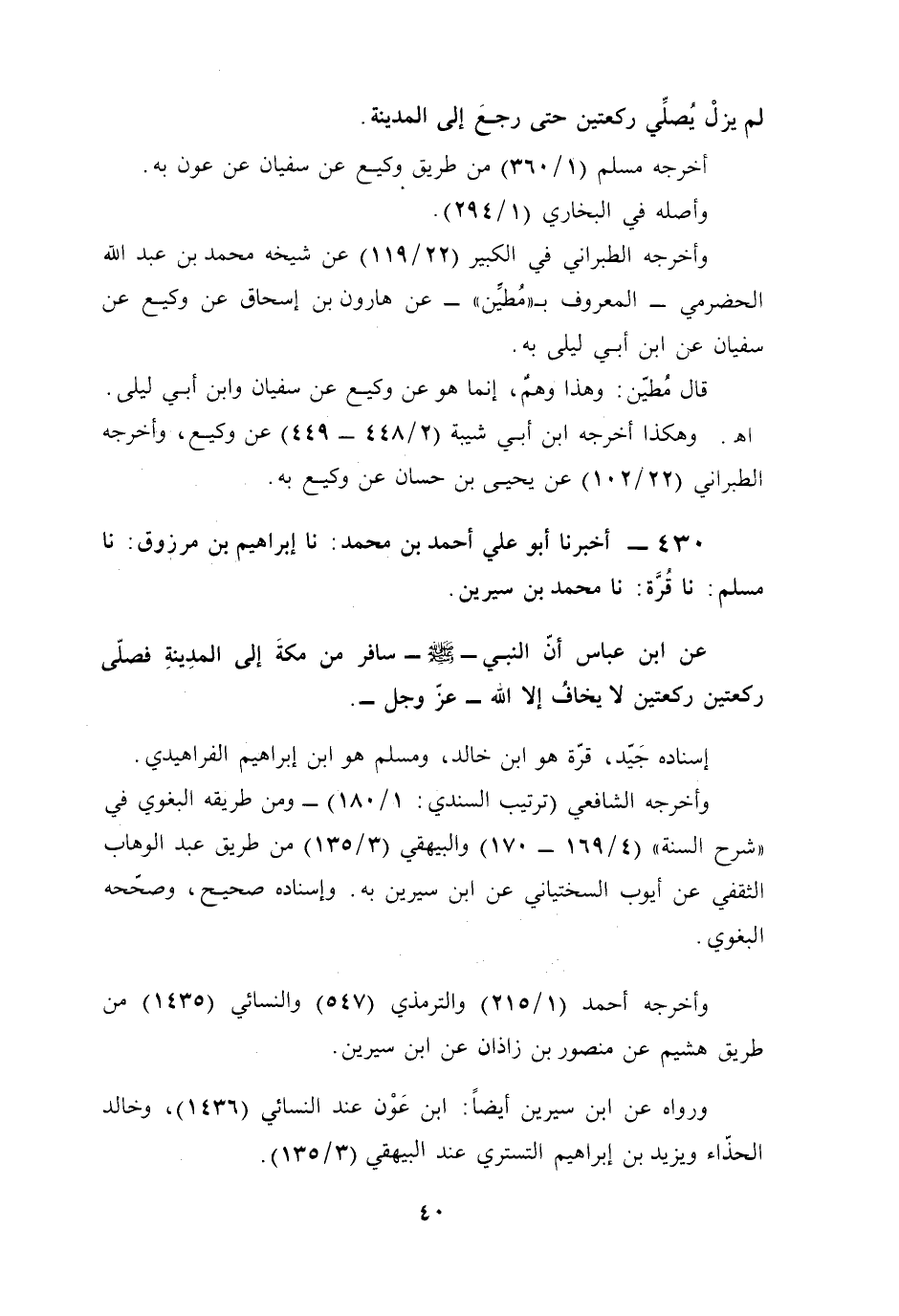 عن ابن عباس أنّ النبي - صلى الله عليه وسلم - سافر من مكةَ إلى المدِينةِ فصلّى ركعتين ركعتين لا يخافُ إلا الله -عَزَّ وجَلَّ-.