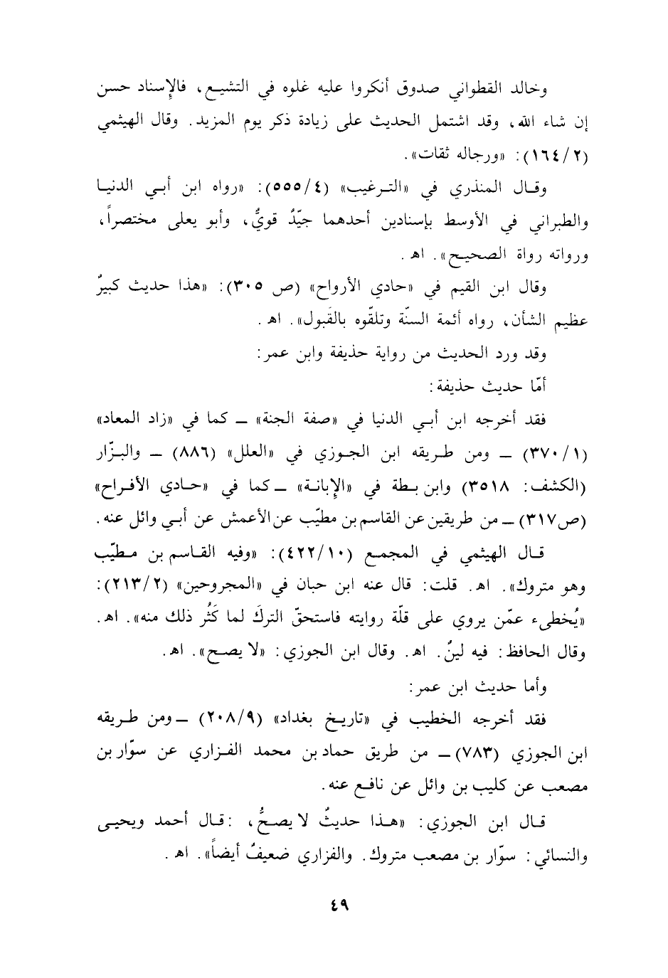وخالد القطواني صدوق أنكروا عليه غلوه في التشيع، فالإِسناد حسن إن شاء الله، وقد اشتمل الحديث على زيادة ذكر يوم المزيد. وقال الهيثمي (2/ 164): "ورجاله ثقات".