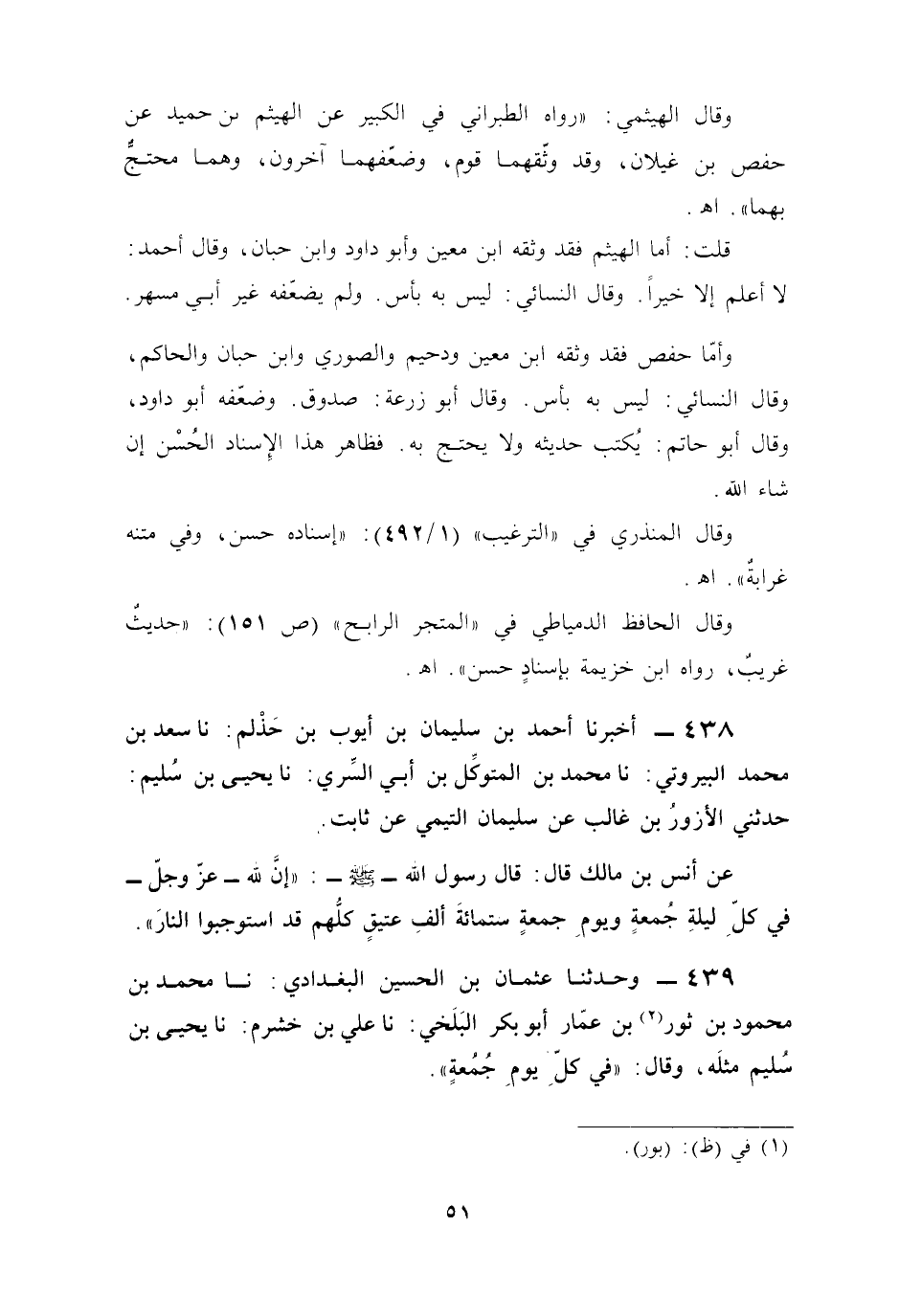 439 - وحدثنا عثمان بن الحسين البغدادي: نا محمَّد بن محمود بن ثور (¬1) بن عمّار أبو بكر البَلَخي: نا علي بن خشرم: نا يحيى بن سُليم مثلَه، وقال: "في كلِّ يومِ جُمُعةٍ".