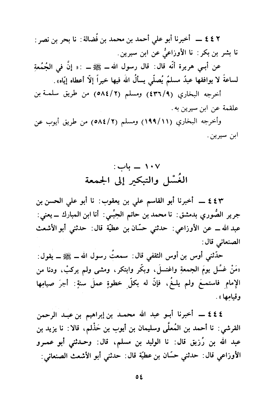443 - أخبرنا أبو القاسم علي بن يعقوب: نا أبو علي الحسن بن جرير الصُّوري بدمشق: نا محمَّد بن حاتم الحِبِّي: أنا ابن المبارك -يعني: عبد الله- عن الأوزاعي: حدثني حسّان بن عطيّة قال: حدثني أبو الأشعث الصنعاني قال: