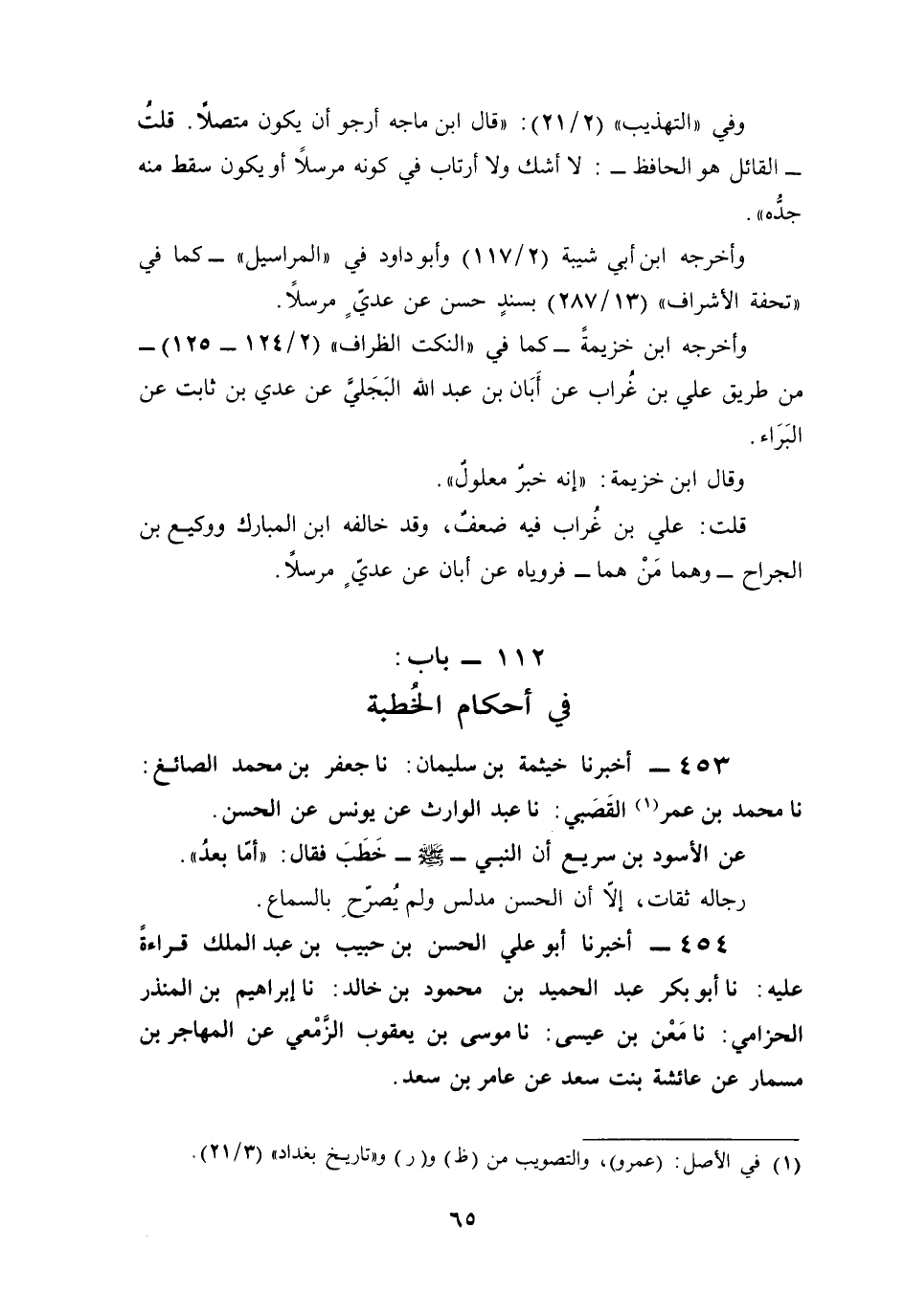 453 - أخبرنا خيثمة بن سليمان: نا جعفر بن محمَّد الصائغ: نا محمَّد بن عمر (¬1) القَصَبي: نا عبد الوارث عن يونس عن الحسن.