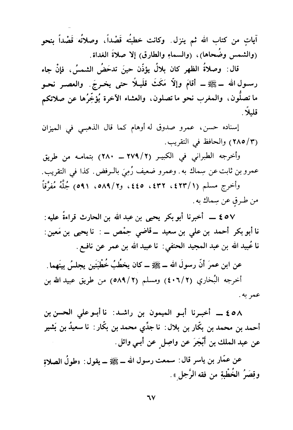 457 - أخبرنا أبو بكر يحيي بن عبد الله بن الحارث قراءةً عليه: نا أبو بكر أحمد بن علي بن سعيد -قاضي حِمْص-: نا يحيى بن مَعين: نا عُبيد الله بن عبد المجيد الحنفي: نا عبيد الله بن عمر عن نافع.