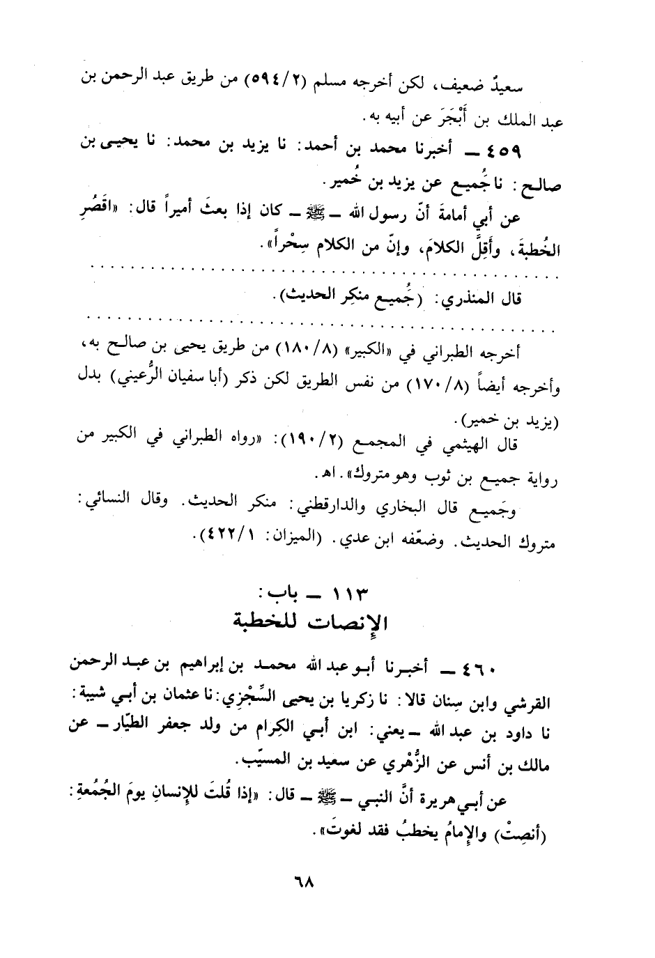 460 - أخبرنا أبو عبد الله محمَّد بن إبراهيم بن عبد الرحمن القرشي وابن سِنان قالا: نا زكريا بن يحيي السِّجْزِي: نا عثمان بن أبي شيبة: نا داود بن عبد الله -يعني: ابن أبى الكِرام من ولد جعفر الطيّار- عن مالك بن أنس عن الزُّهْري عن سعيد بن المسيّب.
