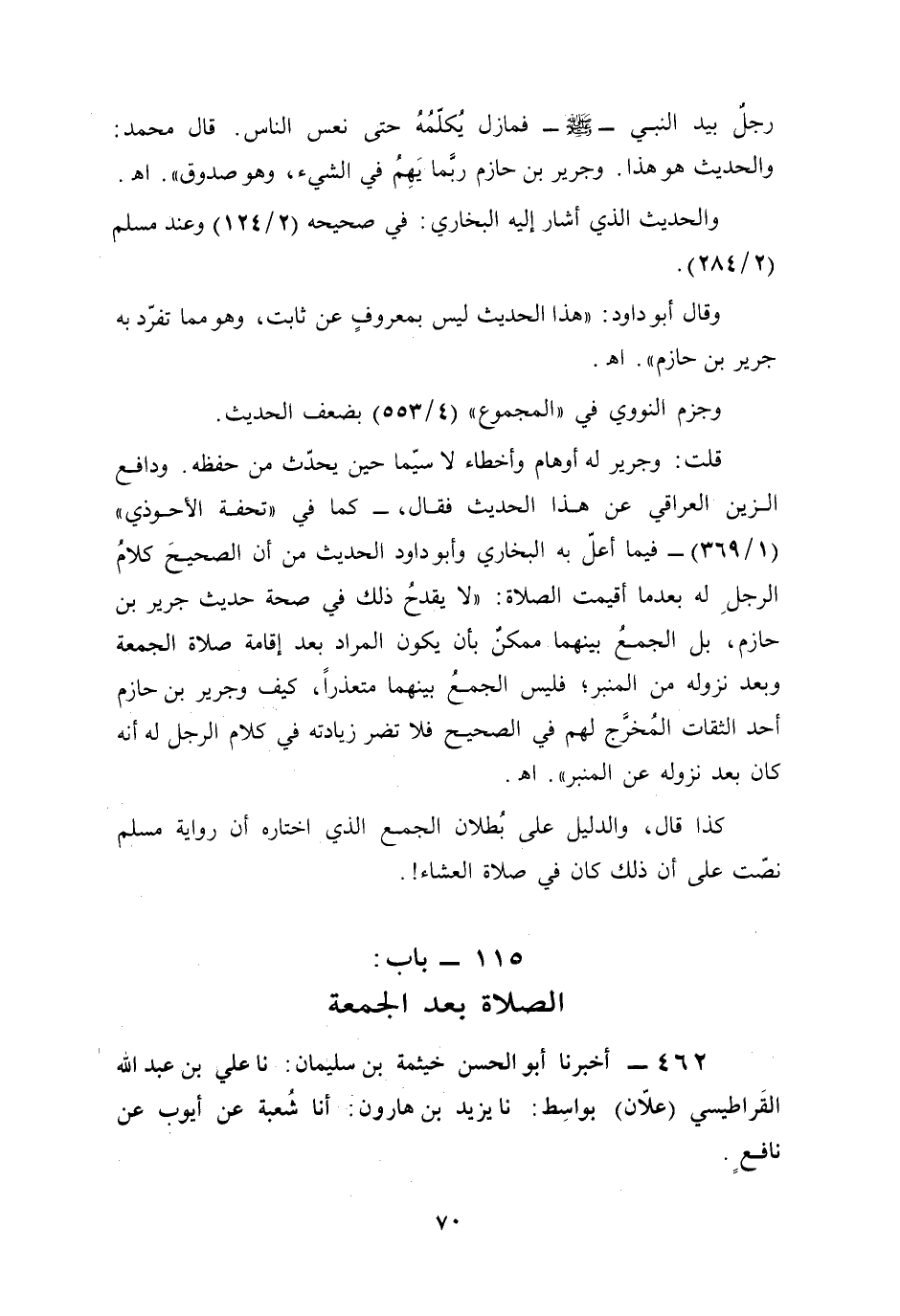 قلت: وجرير له أوهام وأخطاء لا سيّما حين يحدّث من حفظه. ودافع الزين العراقي عن هذا الحديث فقال، -كما في "تحفة الأحوذي" (1/ 369) - فيما أعلّ به البخاري وأبو داود الحديث من أن الصحيحَ كلامُ الرجلِ له بعدما أقيمت الصلاة: "لا يقدحُ ذلك في صحة حديث جرير بن حازم، بل الجمعُ بينهما ممكنٌ بأن يكون المراد بعد إقامة صلاة الجمعة وبعد نزوله من المنبر؛ فليس الجمعث بينهما متعذرًا، كيف وجرير بن حازم أحد الثقات المُخرَّج لهم في الصحيح فلا تضر زيادته في كلام الرجل له أنه كان بعد نزوله عن المنبر". أهـ.