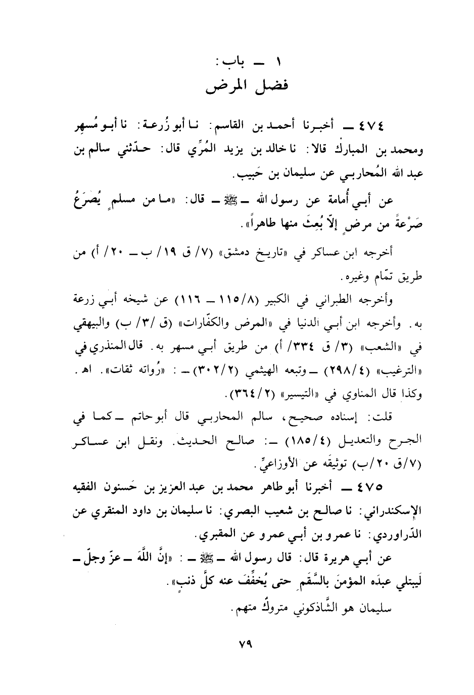 474 - أخبرنا أحمد بن القاسم: نا أبو زُرعة: نا أبو مُسهِر ومحمد بن المبارك قالا: نا خالد بن يزيد المُرِّي قال: حدّثني سالم بن عبد الله المُحاربي عن سليمان بن حَبيب.