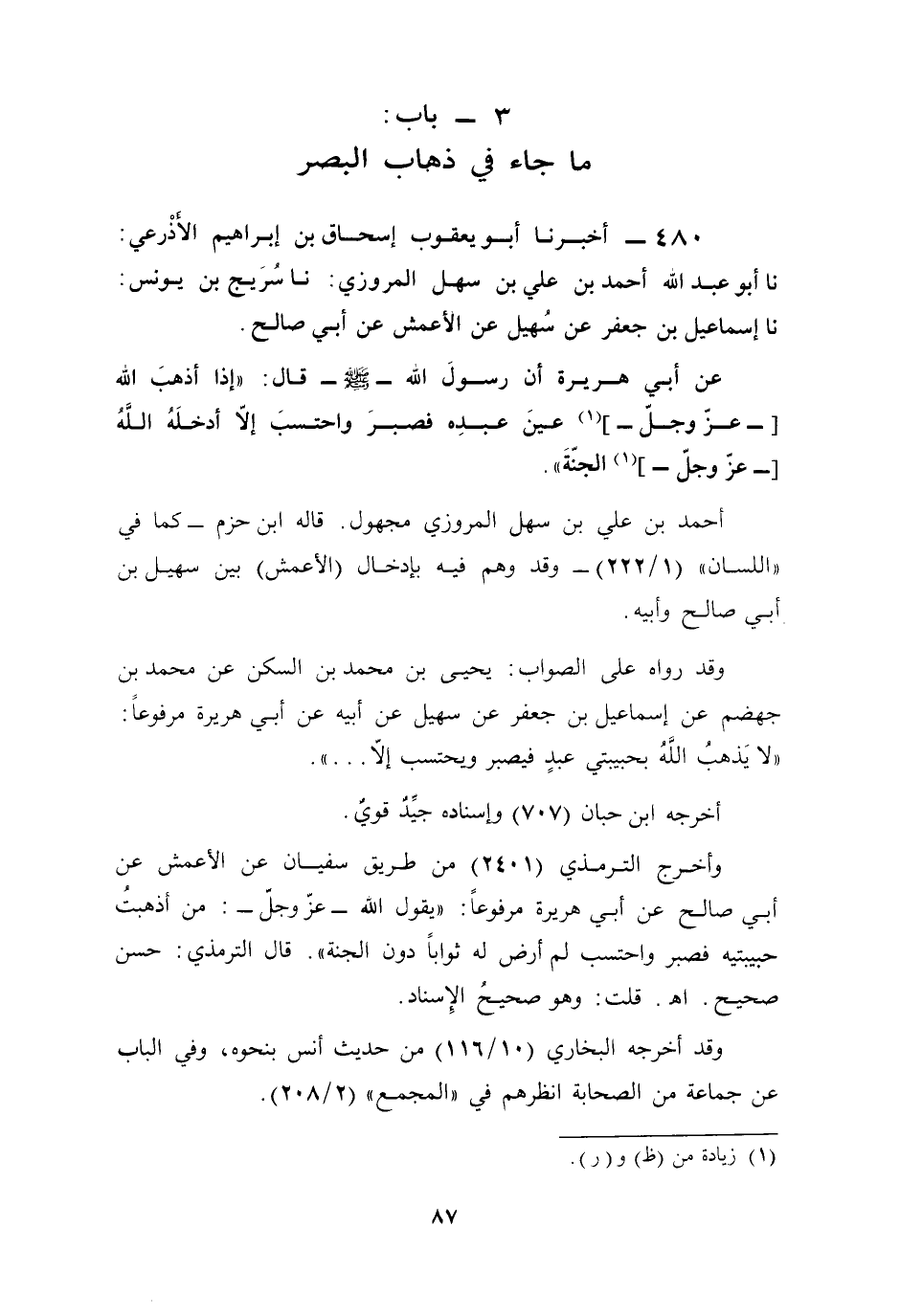 وأخرج الترمذي (2401) من طريق سفيان عن الأعمش عن أبي صالح عن أبي هريرة مرفوعًا: "يقول الله -عَزَّ وجَلَّ-: من أذهبتُ حبيبتيه فصبر واحتسب لم أرض له ثوابًا دون الجنة". قال الترمذي: حسن صحيح. أهـ. قلت: وهو صحيحُ الإِسناد.