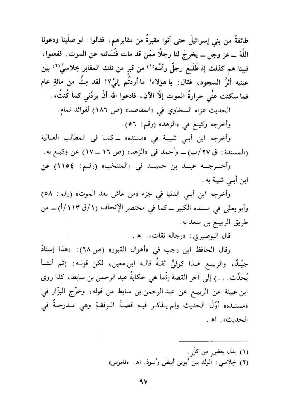 طائفةٌ من بني إسرائيلَ حتى أتوا مقبرةً من مقابرهم، فقالوا: لو صلّينا ودعونا اللهَ -عَزَّ وَجَلَّ - يخرجْ لنا رجلًا ممّن قد مات فنسَائله عن الموت. ففعلوا، فبينا هم كذلك إذ طَلَعَ رجلٌ رأسُه (¬1) من قبرٍ من تلك المقابر خِلاسيٌّ (¬2) بين عينيه أثرُ السجود، فقال: يا هؤلاء! ما أردتُم إلىَّ؟! لقد مِتُّ من مائةِ عام فما سكنت عنِّي حرارةُ الموتِ إلَّا الآن، فادعوا الله أنْ يردَّني كما كُنتُ".