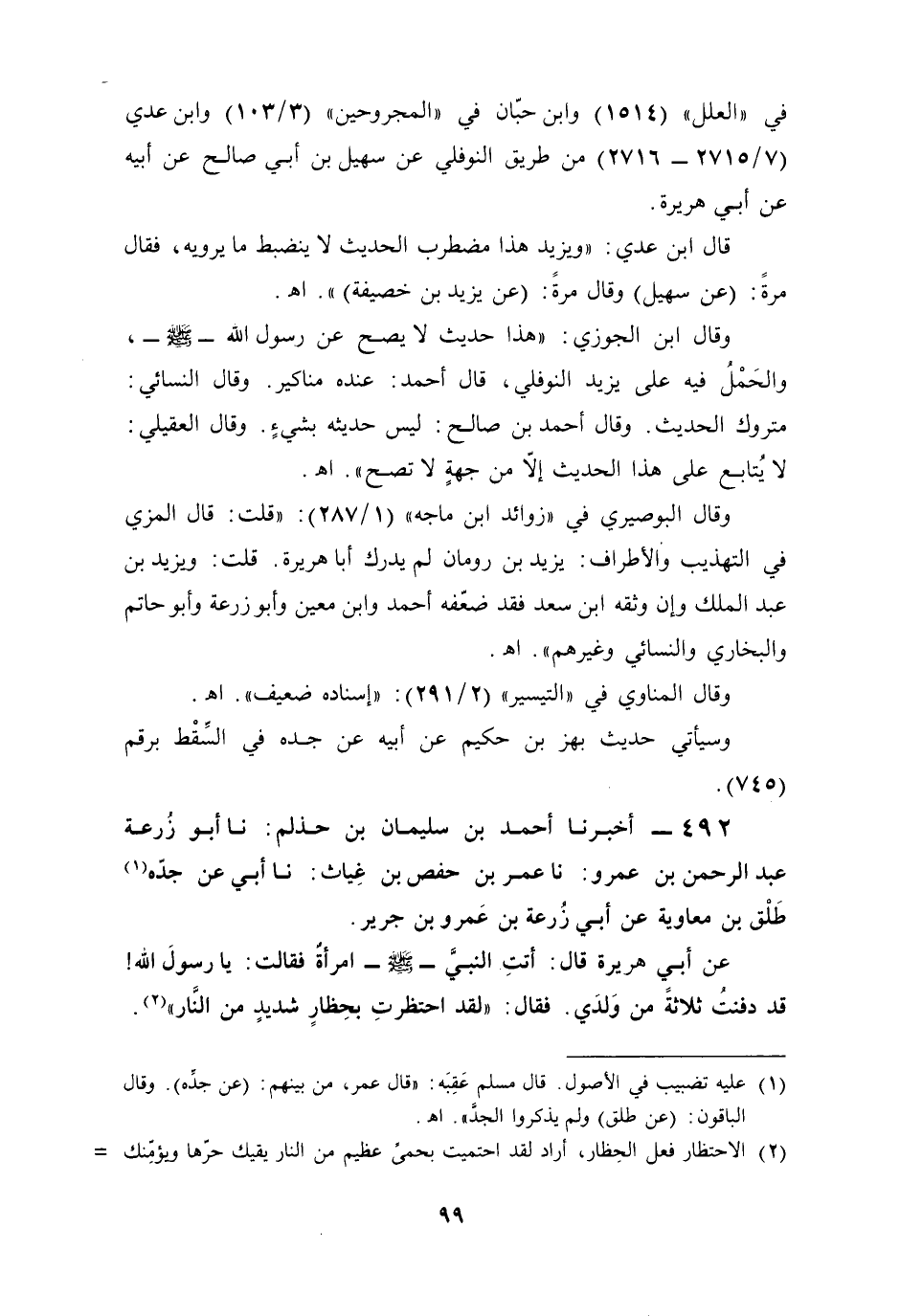 وقال البوصيري في "زوائد ابن ماجه" (1/ 287): "قلت: قال المزي في التهذيب والأطراف: يزيد بن رومان لم يدرك أبا هريرة. قلت: ويزيد بن عبد الملك وإن وثقه ابن سعد فقد ضعّفه أحمد وابن معين وأبو زرعة وأبو حاتم والبخاري والنسائي وغيرهم". أهـ.