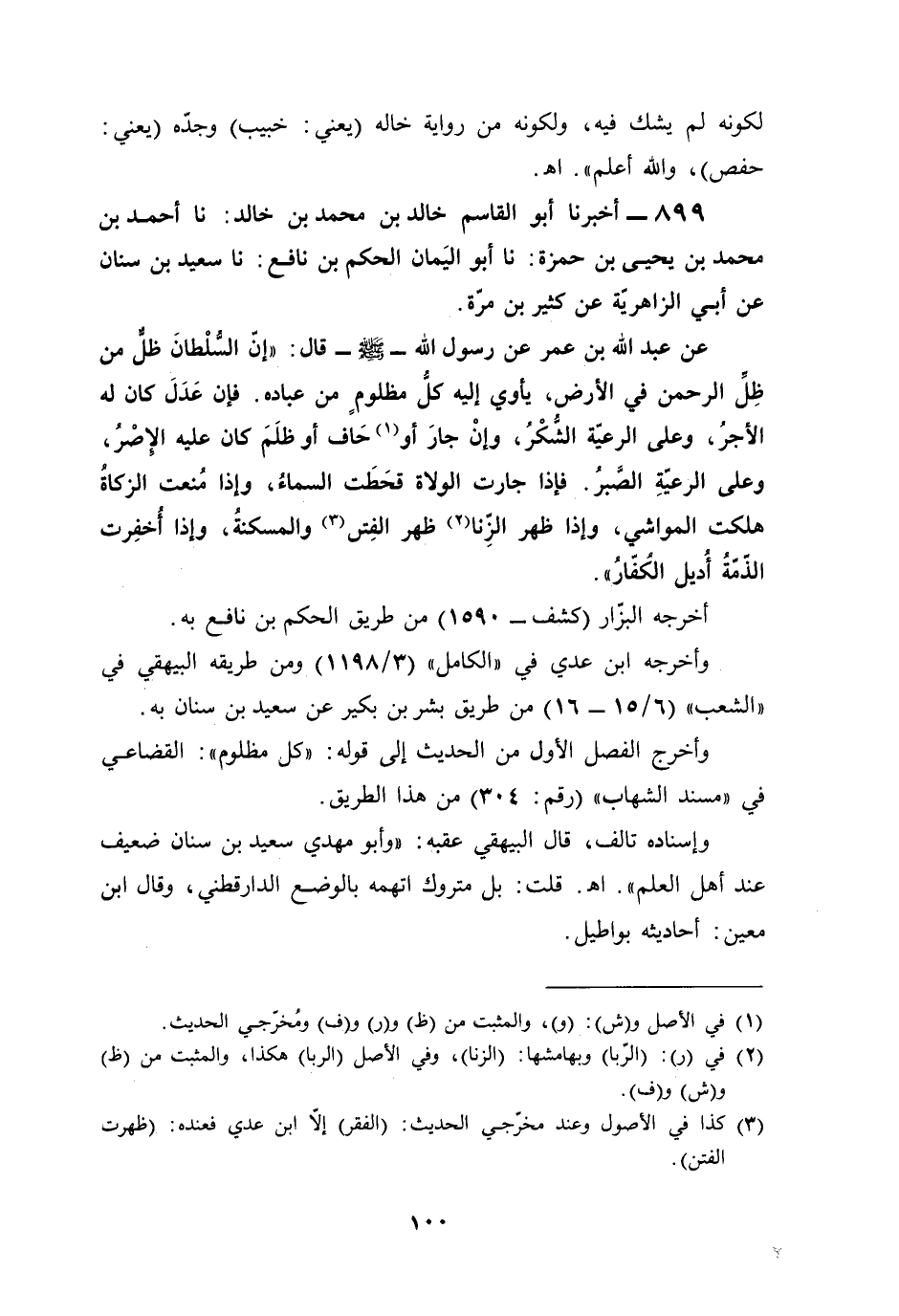 899 - أخبرنا أبو القاسم خالد بن محمد بن خالد: نا أحمد بن محمد بن يحيى بن حمزة: نا أبو اليَمان الحكم بن نافع: نا سعيد بن سنان عن أبي الزاهريّة عن كثير بن مرّة.