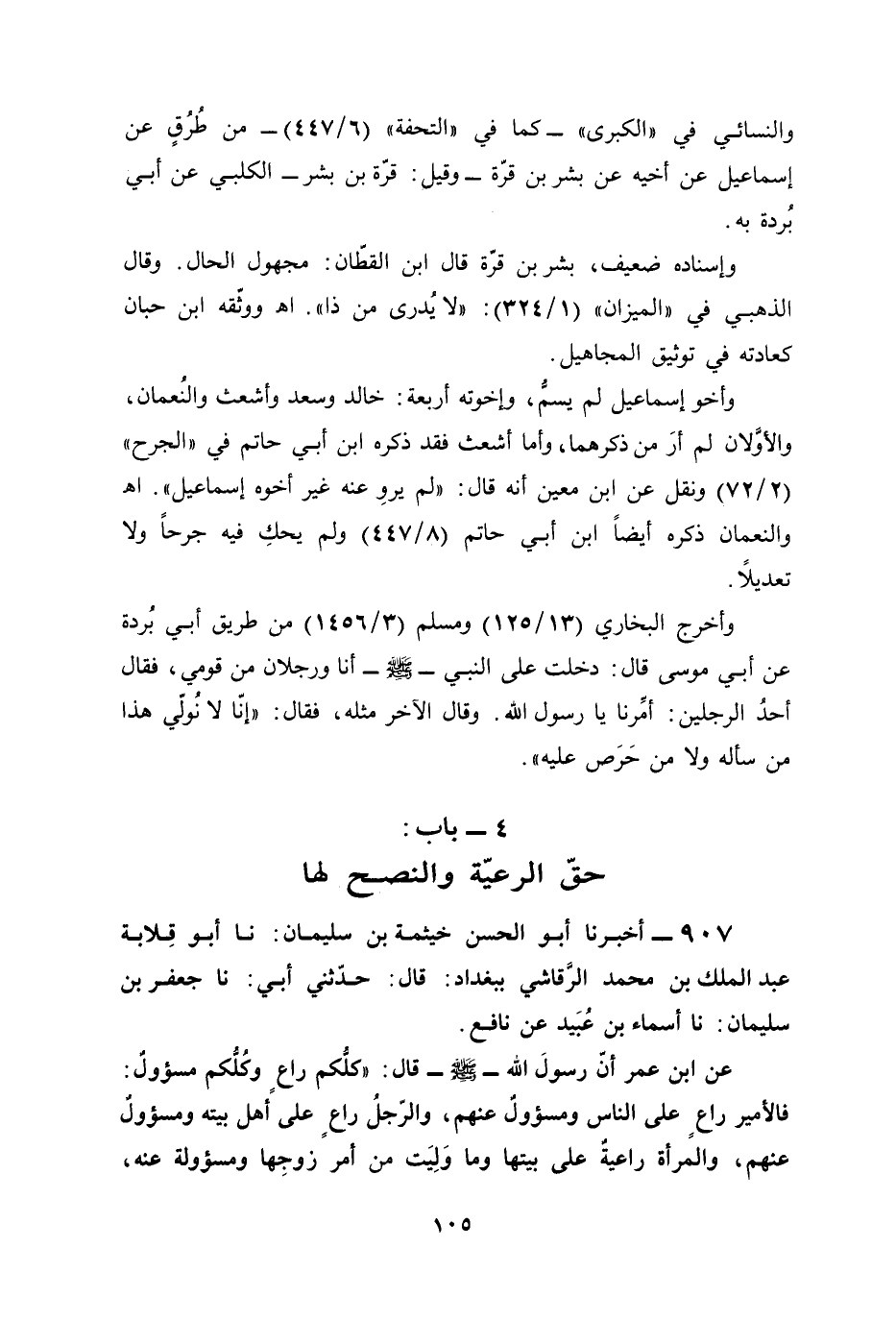 907 - أخبرنا أبو الحسن خيثمة بن سليمان: نا أبو قِلابة عبد الملك بن محمد الرَّقاشي ببغداد: قال: حدّثني أبي: نا جعفر بن سليمان: نا أسماء بن عُبَيد عن نافع.