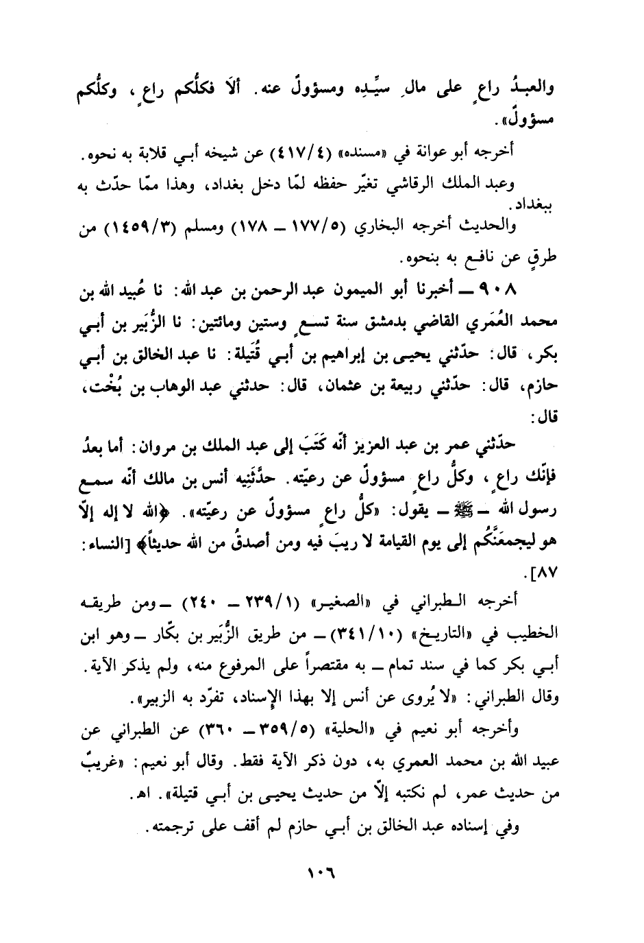 حدّثني عمر بن عبد العزيز أنّه كتَبَ إلى عبد الملك بن مروان: أما بعدُ فإنّك راعٍ، وكلُّ راعٍ مسؤولٌ عن رعيّته. حدَّثَنِيه أنس بن مالك أنّه سمع رسول الله - صلى الله عليه وسلم - يقول: "كلُّ راعٍ مسؤول عن رعيّته". {اللَّهُ لَا إِلَهَ إِلَّا هُوَ لَيَجْمَعَنَّكُمْ إِلَى يَوْمِ الْقِيَامَةِ لَا رَيْبَ فِيهِ وَمَنْ أَصْدَقُ مِنَ اللَّهِ حَدِيثًا} [النساء: 87].
