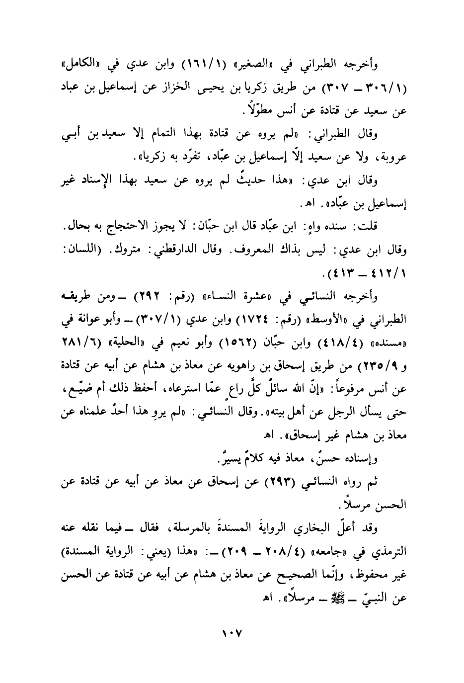 وقد أعلّ البخاري الروايةَ المسندةَ بالمرسلة، فقال -فيما نقله عنه الترمذي في "جامعه" (4/ 208 - 209) -: "هذا (يعني: الرواية المسندة) غير محفوظ، وإنّما الصحيح عن معاذ بن هشام عن أبيه عن قتادة عن الحسن عن النبيّ - صلى الله عليه وسلم - مرسلًا". أهـ