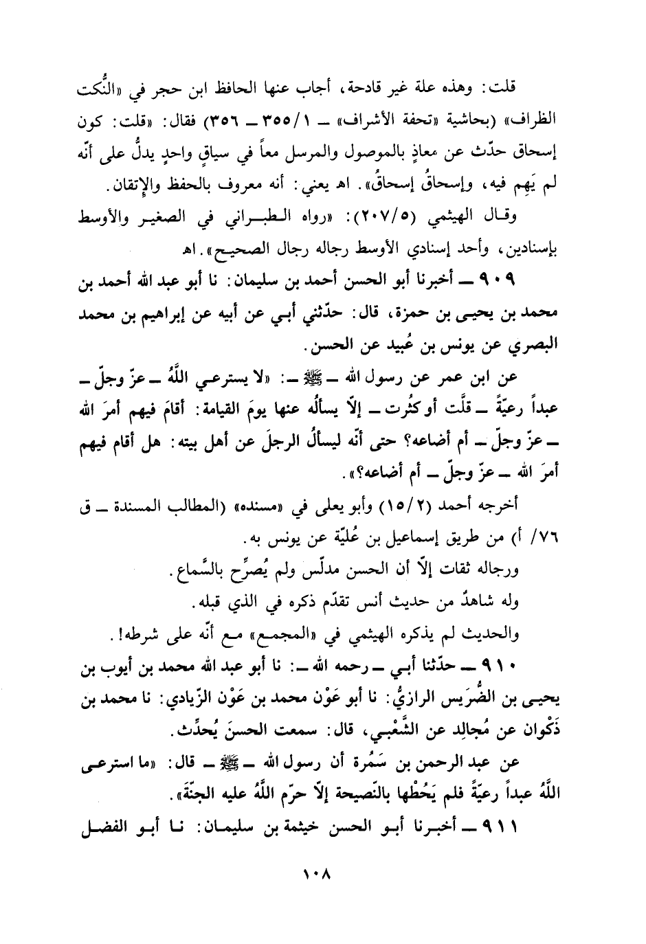 909 - أخبرنا أبو الحسن أحمد بن سليمان: نا أبو عبد الله أحمد بن محمد بن يحيى بن حمزة، قال: حدّثني أبي عن أبيه عن إبراهيم بن محمد البصري عن يونس بن عُبيد عن الحسن.