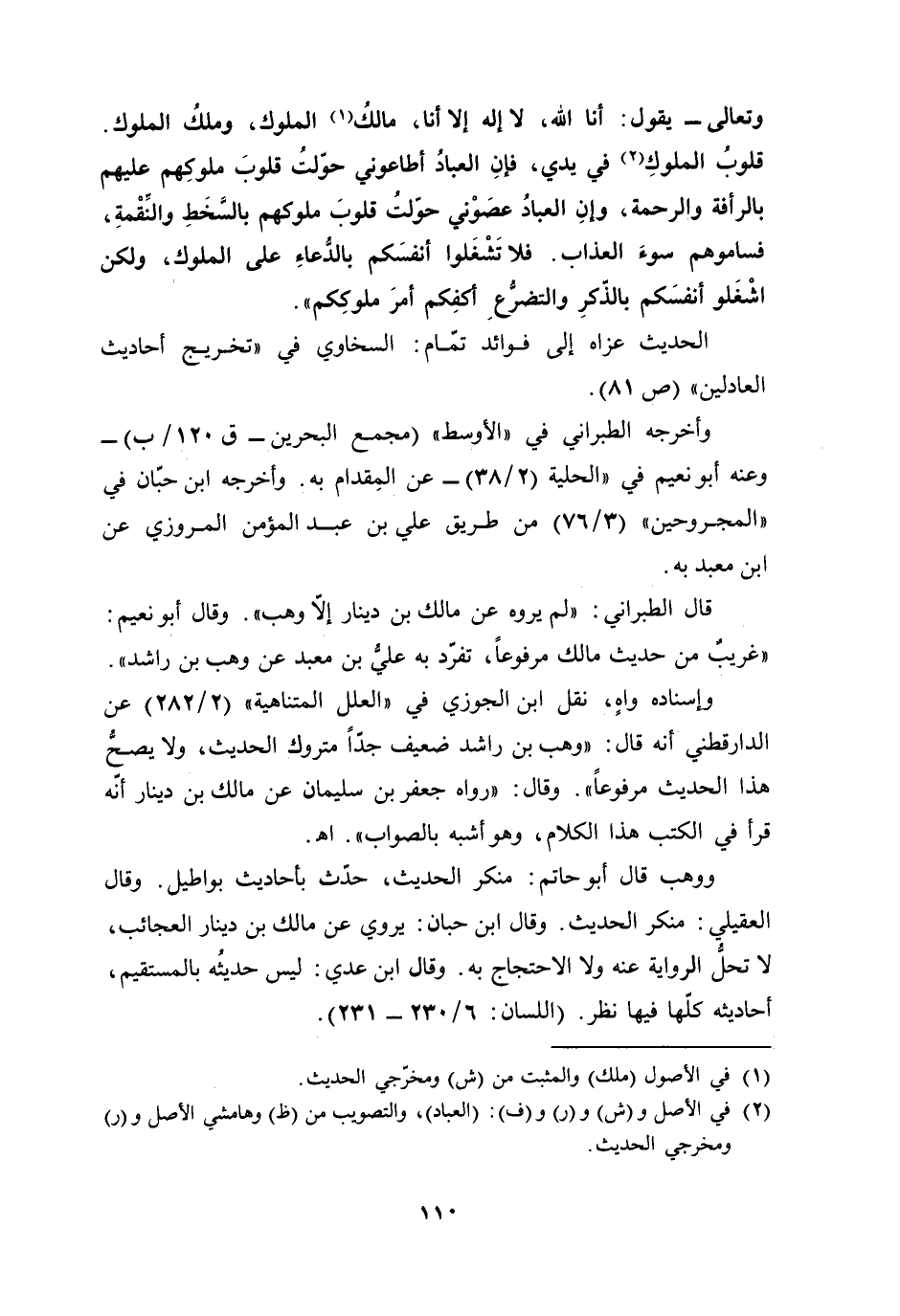 وتعالى- يقول: أنا الله، لا إله إلا أنا، مالكُ (¬1) الملوك، وملكُ الملوك. قلوبُ الملوكِ (¬2) في يدي، فإنِ العبادُ أطاعوني حوّلتُ قلوبَ ملوكِهم عليهم بالرأفة والرحمة، وإنِ العبادُ عصَوْني حوّلتُ قلوبَ ملوكهم بالسَّخَطِ والنِّقْمةِ، فساموهم سوءَ العذاب. فلا تَشْغَلوا أنفسَكم بالدُّعاءِ على الملوك، ولكن اشْغَلو أنفسَكم بالذّكرِ والتضرُّعِ أكفِكم أمرَ ملوكِكم".