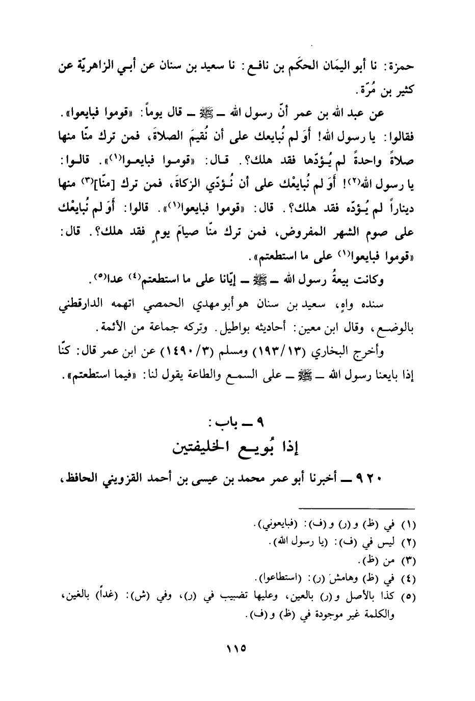 عن عبد الله بن عمر أنّ رسول الله - صلى الله عليه وسلم - قال يومًا: "قوموا فبايعوا". فقالوا: يا رسول الله! أَوَ لم نُبايعك على أن نُقيمَ الصلاةَ، فمن ترك منّا منها صلاةً واحدةً لم يُؤدّها فقد هلك؟. قال: "قوموا فبايعوا (¬1) ". قالوا: يا رسول الله (¬2)! أَوَ لم نُبايعْك على أن نُؤدّي الزكاةَ، فمن ترك [منّا] (¬3) منها دينارًا لم يُؤدّه فقد هلك؟. قال: "قوموا فبايعوا (1) ". قالوا: أَوَ لم نُبايعْك على صوم الشهر المفروض، فمن ترك منّا صيامَ يومٍ فقد هلك؟. قال: "قوموا فبايعوا (1) على ما استطعتم".