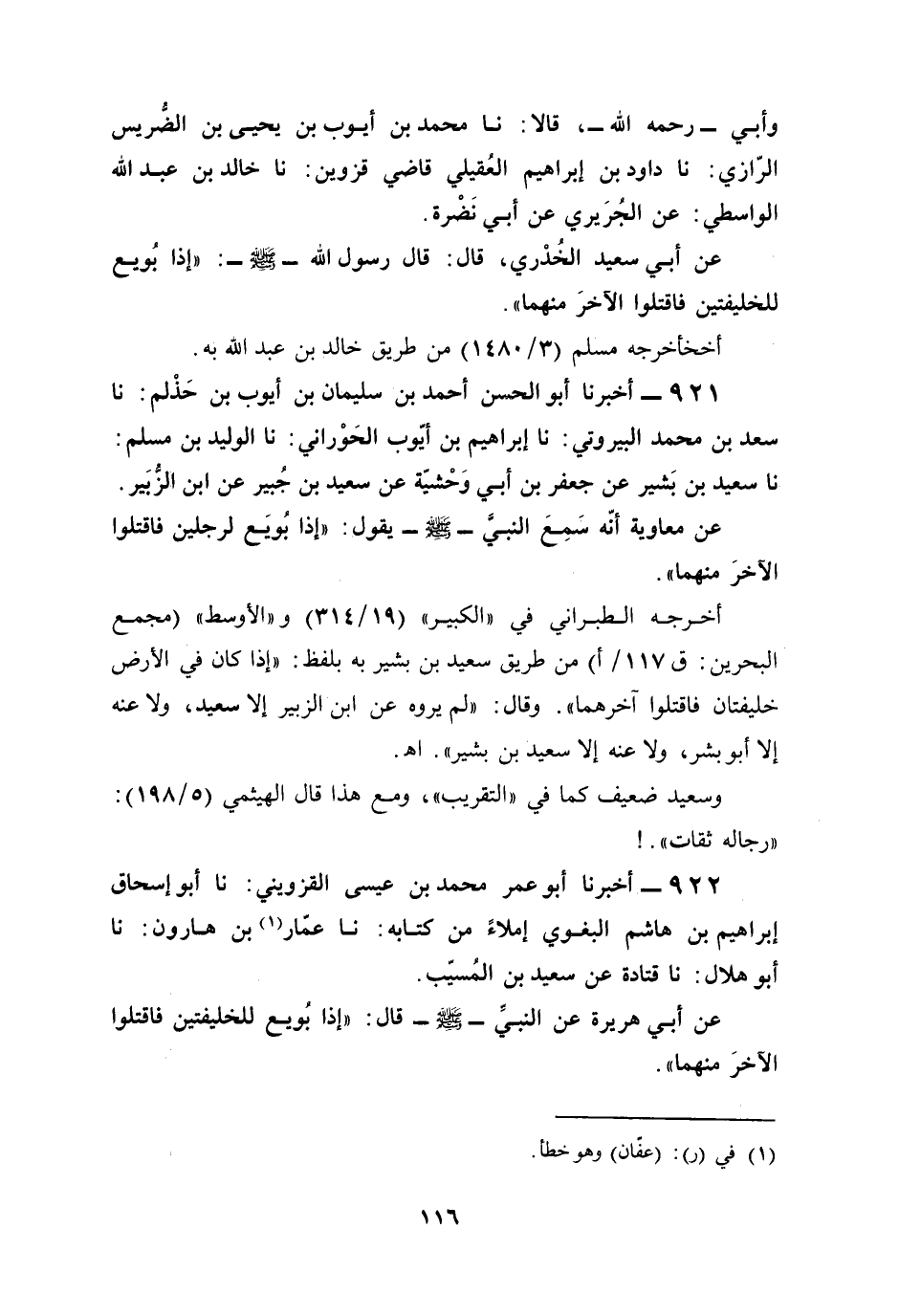 عن أبي سعيد الخُدْري، قال: قال رسول الله - صلى الله عليه وسلم -: "إذا بُويع للخليفتين فاقتلوا الآخرَ منهما".