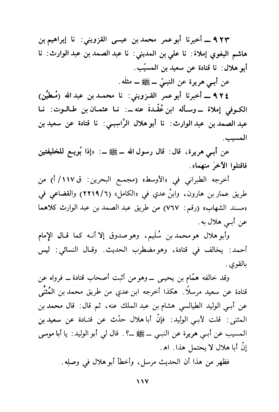 923 - أخبرنا أبو عمر محمد بن عيسى القزويني: نا إبراهيم بن هاشم البغوي إملاءً: نا علي بن المديني: نا عبد الصمد بن عبد الوارث: نا أبو هلال: نا قتادة عن سعيد بن المسيّب.
