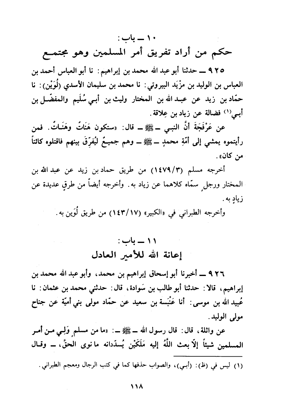 925 - حدثنا أبو عبد الله محمد بن إبراهيم: نا أبو العباس أحمد بن العباس بن الوليد بن مزْيَد البيروتي: نا محمد بن سليمان الأسدي (لُوَيْن): نا حمّاد بن زيد عن عبد الله بن المختار وليث بن أبي سُلَيم والمفضّل بن أبي (¬1) فضالة عن زياد بن عِلاقة.